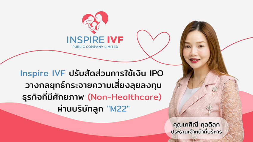นางสาวเกศิณี กุลดิลก ประธานเจ้าหน้าที่บริหาร บริษัท อินสไปร์ ไอวีเอฟ จำกัด (มหาชน) หรือ “IVF” เปิดเผยว่า “สำหรับการปรับเปลี่ยนและเพิ่มวัตถุประสงค์ในการลงทุนเพื่อรองรับการเติบโตของธุรกิจในอนาคต ผู้ถือหุ้นมีมติอนุมัติการเพิ่มวัตถุประสงค์การใช้เงิน IPO จำนวน 388 ล้านบาท จากเดิมที่มี 3 ข้อ ประกอบด้วย 1. ใช้เป็นเงินทุนหมุนเวียนจำนวน 84 ล้านบาท, 2. ใช้เป็นเงินลงทุนในการขยายสาขาจำนวน 190 ล้านบาท และ 3. ใช้เป็นเงินลงทุนในธุรกิจที่เกี่ยวเนื่องจำนวน 114 ล้าน บาท เป็น 4 ข้อ ประกอบด้วย 1. ใช้เป็นเงินทุนหมุนเวียนจำนวน 158 ล้านบาท, 2. ใช้เป็นเงินลงทุนในการขยายสาขาจำนวน 50 ล้านบาท, 3. ใช้เป็นเงินลงทุนในธุรกิจที่เกี่ยวเนื่องจำนวน 30 ล้านบาท และ 4. ใช้เป็นเงินลงทุนในธุรกิจอื่นที่มีศักยภาพ (Non-Healthcare) 150 ล้านบาท”
