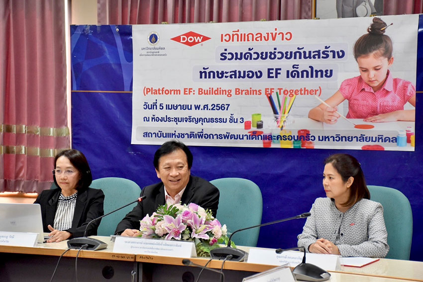 สถาบันแห่งชาติเพื่อการพัฒนาเด็กและครอบครัว มหาวิทยาลัยมหิดล ร่วมกับกลุ่มบริษัท ดาว ประเทศไทย (Dow) จัดทำ “แพลตฟอร์ม EF ปี 2567: ร่วมด้วยช่วยกันสร้างทักษะสมอง EF เด็กไทย (Platform EF: Building Brains EF Together)” ซึ่งเป็นช่องทางการเผยแพร่และแลกเปลี่ยนองค์ความรู้และเสริมสร้างความเข้าใจในการพัฒนาเด็กด้วยทักษะสมองอีเอฟ (Executive Functions) โดยมุ่งเน้นให้ครู นักวิชาการสาธารณสุข ผู้ปกครอง และผู้สนใจทั่วไปมีโอกาสเข้าถึงสื่อการเรียนรู้และการเสวนาจากนักวิขาการผู้ทรงคุณวุฒิของไทย ที่สามารถนำไปปรับใช้ในการเลี้ยงดูบุตรหลานให้เติบโตเป็น ‘คนดี’ และ ‘คนเก่ง’ ขยายผลการพัฒนาพลเมืองคุณภาพที่พร้อมจะขับเคลื่อนประเทศชาติในอนาคต
