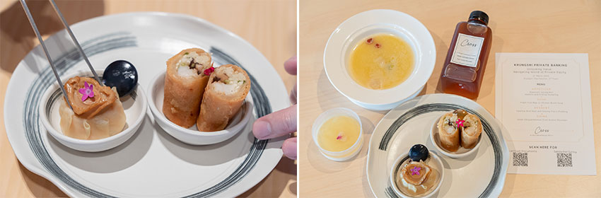 ความพิเศษเหนือระดับครั้งนี้ยกให้ เชฟไอซ์ ศิวพล ปลื้มธีรวงศ์ หนึ่งในผู้ก่อตั้งและเชฟหลักจาก Cross BKK ที่มารังสรรค์เซทอาหารจีนสไตล์ Fine Dining ให้กับลูกค้ากรุงศรี ไพรเวท แบงก์กิ้ง ได้ลิ้มรส เริ่มต้นด้วยเมนูเรียกน้ำย่อยอย่างเปาะเปี๊ยะรื่นรส และขนมจีบหอยเชลล์และเป๋าฮื้อฟูเจี้ยน เสิร์ฟพร้อมซุปไก่กระเพาะปลาสด เมนูซิกเนเจอร์ที่ส่งต่อจากรุ่นสู่รุ่น ตัวซุปไก่สูตรเฉพาะเคี่ยวจากไก่แก่และกังป๋วยจนได้เป็นน้ำซุปสีขาว รสเข้มข้น มีกลิ่นหอมเฉพาะตัว ทานคู่กับกระเพาะปลาสดอย่างดีที่ใช้เวลาในการทำนานถึง 4 วันกว่าจะได้ซุปที่ได้ลิ้มลองกัน นอกจากกระเพาะปลาที่ถูกตุ๋นจนนุ่มแต่ไม่เหนียวแล้ว ยังตัดเลี่ยนด้วยหอยเชลล์แห้งและส่วนผสมของยาจีนอย่างฮ่วยซัวและเก๋ากี้ ที่ทำให้ซุปชามนี้กลมกล่อม ซดคล่องคอ