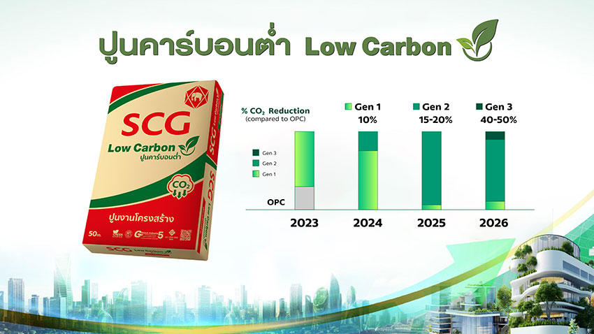 ธุรกิจเอสซีจี ซีเมนต์แอนด์กรีนโซลูชัน พัฒนานวัตกรรมปูนซีเมนต์หลากหลายประเภทตามการใช้งาน ล่าสุดการใช้ ‘ปูนคาร์บอนต่ำ’ มีสัดส่วนเพิ่มขึ้นเป็นร้อยละ 85 และวันที่ 5 พฤษภาคมนี้ จะเปิดตัวปูนคาร์บอนต่ำ (เจเนอเรชัน 2) ซึ่งลดการปล่อยคาร์บอนไดออกไซด์ได้ร้อยละ 15-20 เทียบเท่ามาตรฐานสากล พร้อมตั้งเป้าปีนี้ เปลี่ยนกระบวนการผลิตทุกโรงงานปูนซีเมนต์ในไทยให้เป็นปูนคาร์บอนต่ำ (เจเนอเรชัน 2) ขณะเดียวกันยังต่อยอดสู่ผลิตภัณฑ์คาร์บอนต่ำอื่น ๆ ด้วย อาทิ ‘คอนกรีตคาร์บอนต่ำ ซีแพค’ ลดการปล่อยคาร์บอนไดออกไซด์ในกระบวนการผลิตได้อย่างน้อย 25 กิโลกรัม/ลูกบาศก์เมตร หรือเท่ากับการปลูกต้นไม้ 25 ต้น สำหรับทุกการใช้งานคอนกรีต 10 ลูกบาศก์เมตร โดยคงคุณสมบัติเทียบเท่าหรือดีขึ้นกว่าเดิม ‘เสือ เดคอร์ คาร์บอนต่ำ’ ปูนซีเมนต์สำเร็จรูปสูตรคาร์บอนต่ำ สำหรับงานหล่อพื้นหรือฉาบตกแต่งผนัง ปล่อยคาร์บอนไดออกไซด์น้อยลงร้อยละ 38 เมื่อเทียบกับปูนซีเมนต์ปอร์ตแลนด์ รวมทั้งเสิร์ฟปูนซีเมนต์ให้ลูกค้าทุกเซกเมนต์ อาทิ ‘ปูนงานโครงสร้างทนทานพิเศษ เอสซีจี คาร์บอนต่ำ สูตรปูนคนใต้’ พัฒนาให้เหมาะกับสภาพพื้นที่ของภาคใต้ ‘คอนกรีตชายเล ซีแพค และคอนกรีตมารีน ซีแพค’ สำหรับพื้นที่ภาคใต้ ภาคตะวันออก และภาคตะวันตก ป้องกันโครงสร้าง สิ่งปลูกสร้างใกล้ชายฝั่งทะเล ‘คอนกรีตซีแพค ซูเปอร์ ทนดินเค็ม’ สำหรับภาคอีสาน ซึ่งเป็นพื้นที่ดินเค็ม ต้านทานการซึมผ่านของคลอไรด์และซัลเฟตที่สะสมใต้ดิน นอกจากนี้ โรงงานปูนซีเมนต์ในประเทศได้เพิ่มสัดส่วนการใช้เชื้อเพลิงทดแทนถึงร้อยละ 47 ส่วนโรงงานปูนซีเมนต์ทุ่งสงที่ได้ปรับปรุงกระบวนการผลิตให้มีประสิทธิภาพสูงขึ้น เพื่อรองรับการใช้เชื้อเพลิงทดแทน