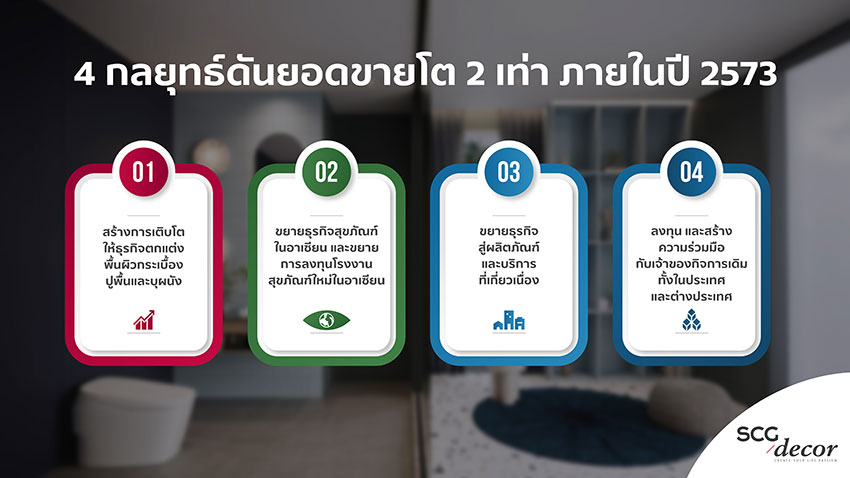 ธุรกิจเอสซีจี เดคคอร์ หรือ SCGD ชู 4 กลยุทธ์ดันยอดขายโต 2 เท่า ภายในปี 2573 รับตลาดอาเซียนทยอยฟื้นตัว ได้แก่ 1) สร้างการเติบโตให้ธุรกิจตกแต่งพื้นผิวกระเบื้องปูพื้นและบุผนัง ผ่านการดำเนินงานต่าง ๆ อาทิ ขยายการลงทุนโรงงานในพื้นที่ภาคใต้ของเวียดนาม เพิ่มยอดขายสินค้าที่มีมูลค่าเพิ่มสูง และขยายช่องทางการจำหน่าย 2) ขยายธุรกิจสุขภัณฑ์ในอาเซียน และขยายการลงทุนโรงงานสุขภัณฑ์ใหม่ในอาเซียน ตั้งเป้ายอดขายสุขภัณฑ์เติบโต 2 เท่า หรือกว่า 10,000 ล้านบาท 3) ขยายธุรกิจสู่ผลิตภัณฑ์และบริการที่เกี่ยวเนื่อง ตอกย้ำการเป็นผู้นำด้านการให้บริการแบบครบวงจร และเพิ่มโอกาสขายสินค้าที่เกี่ยวข้อง และ 4) ลงทุนและเข้าเป็นพันธมิตรทางธุรกิจในธุรกิจหลักของบริษัท ทั้งในประเทศและต่างประเทศ นอกจากนี้ยังเน้นลงทุนเพื่อเพิ่มประสิทธิภาพและลดต้นทุนการผลิตควบคู่กันไป อาทิ โครงการติดตั้ง Hot Air Generator เพื่อลดต้นทุนพลังงานที่โรงงานในไทยอีก 2 แห่ง คาดว่าจะแล้วเสร็จในเดือนพฤษภาคมนี้ และโครงการปรับปรุงสายการผลิตกระเบื้องไวนิล SPC ซึ่งจะเริ่มผลิตสินค้าป้อนตลาดในไทยได้ตั้งแต่ปลายไตรมาส 2 ด้วยกำลังการผลิต 1.8 ล้านตารางเมตรต่อปี