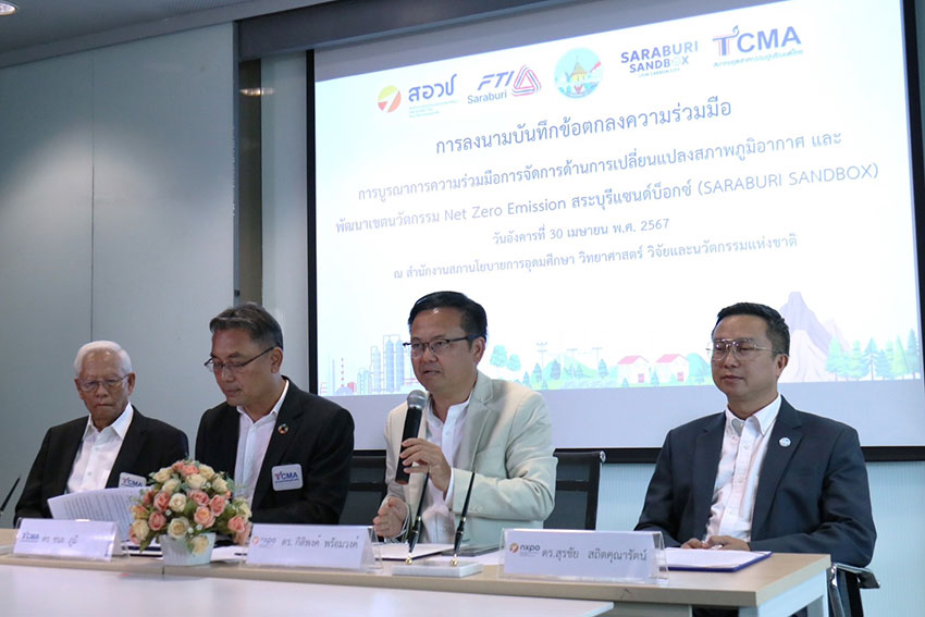 สำนักงานสภานโยบายการอุดมศึกษา วิทยาศาสตร์ วิจัยและนวัตกรรมแห่งชาติ (สอวช.) และ สมาคมอุตสาหกรรมปูนซีเมนต์ไทย (TCMA) ร่วมลงนามบันทึกข้อตกลงความร่วมมือการบูรณาการความร่วมมือการจัดการด้านการเปลี่ยนแปลงสภาพภูมิอากาศ และพัฒนาเขตนวัตกรรม Net Zero Emission สระบุรีแซนด์บ็อกซ์ (SARABURI SANDBOX) โดยมี ดร.กิติพงค์ พร้อมวงค์ ผู้อำนวยการ สอวช. และ ดร.ชนะ ภูมี นายก TCMA ร่วมลงนาม