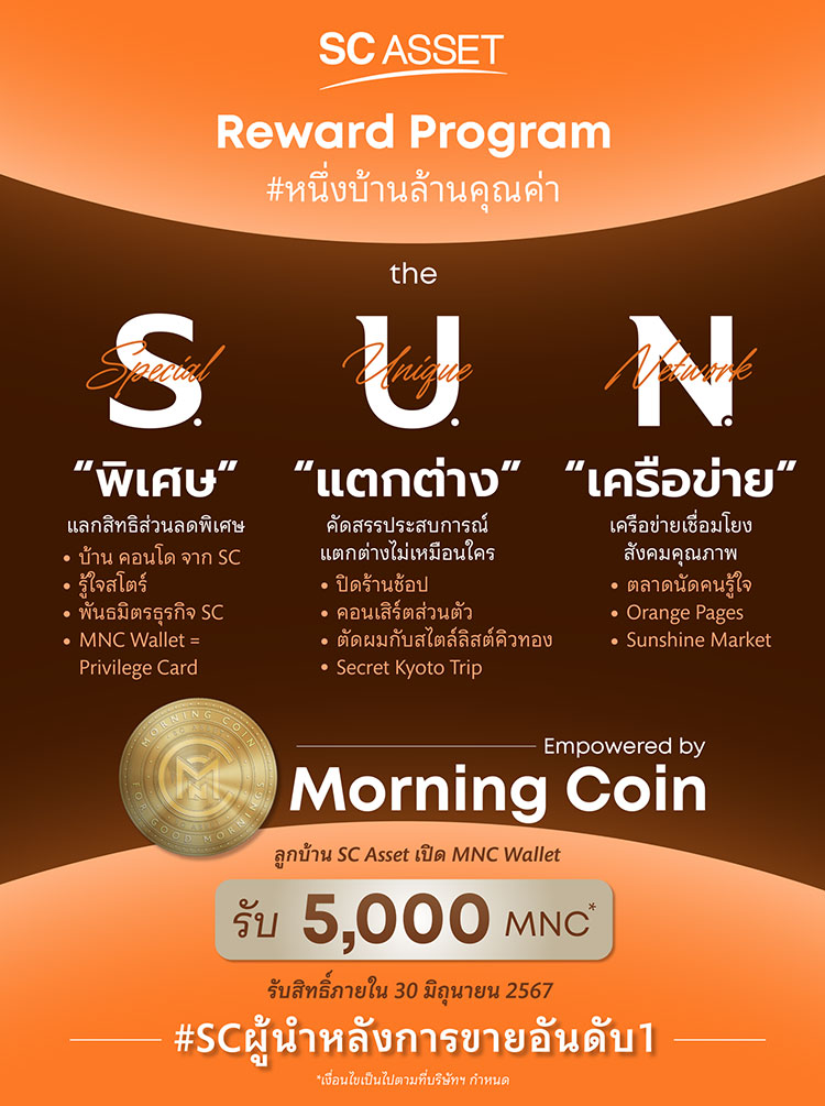 นายณัฐพงศ์ คุณากรวงศ์ ประธานเจ้าหน้าที่บริหาร บริษัท เอสซี แอสเสท คอร์ปอเรชั่น จำกัด (มหาชน) หรือ SC ผู้นำอสังหาริมทรัพย์คุณภาพและมีนวัตกรรม กล่าวว่า “SC มุ่งสร้างคุณค่าและคุณภาพชีวิตที่ดีให้ลูกบ้าน ด้วยนวัตกรรมที่ทันสมัยตามแนวคิด #หนึ่งบ้านล้านคุณค่า ที่เชื่อว่าการลงทุนที่อยู่อาศัยนอกจากจะได้บ้านและคอนโดแล้ว ยังควรได้คุณภาพชีวิตที่ดีจากการได้สิทธิประโยชน์ต่างๆ อีกด้วย จึงเป็นที่มาของการเปิดตัว “มอร์นิง คอยน์” (Morning Coin - MNC) ที่มีการนำเทคโนโลยีบล็อกเชนที่จะเชื่อมโยงลูกบ้านสู่โลกแห่งสิทธิพิเศษมากมาย ภายใต้ SC Asset Reward Program “The S.U.N.” ประกอบด้วย