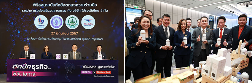 นายภาสกร ชัยรัตน์ อธิบดีกรมส่งเสริมอุตสาหกรรม เปิดเผยว่า กรมส่งเสริมอุตสาหกรรม หรือ ดีพร้อม มีทิศทางการทำงานที่สอดรับกับการเปลี่ยนแปลงของโลก ตามนโยบาย “RESHAPE THE FUTURE : โลกเปลี่ยน อุตสาหกรรมปรับ พร้อมรับอนาคต” ภายใต้แนวคิด “ชุมชนเปลี่ยน” ผ่านการบูรณาการเครือข่ายความร่วมมือ (DIPROM CONNECTION) กับบริษัท ไปรษณีย์ไทย จำกัด เพื่อพัฒนาศักยภาพและสร้างโอกาสทางการตลาดในการยกระดับขีดความสามารถวิสาหกิจไทยให้มีความยั่งยืน ผ่านการเสริมสร้างองค์ความรู้ในด้านการพัฒนาผลิตภัณฑ์ กระบวนการผลิต มาตรฐาน และออกแบบบรรจุภัณฑ์ให้ทันสมัยสอดรับกับเทรนด์โลก รวมถึงมีการแลกเปลี่ยนองค์ความรู้ในการจัดเก็บสินค้า และระบบคลังสินค้า ตลอดจนได้มอบสิทธิประโยชน์อัตราพิเศษในการขนส่งสินค้าจากผู้ผลิตไปยังผู้รับปลายทางอย่างมีคุณภาพ พร้อมขยายช่องทางการจัดจำหน่ายสินค้าผ่านช่องทางออนไลน์บนเว็บไซต์ ThailandpostMart และออฟไลน์ ณ ที่ทำการไปรษณีย์และเครือข่ายพันธมิตรกว่า 50,000 แห่งทั่วประเทศ นอกจากนี้ ยังมีการส่งเสริมความร่วมมือในการบริหารจัดการวัสดุเหลือใช้ อาทิ กล่อง ซอง ขวดน้ำ ถุงพลาสติก และขยะอิเล็กทรอนิกส์ โดยได้เตรียมจุดรับวัสดุเหลือใช้เหล่านี้ให้แก่สถานประกอบการ ภายใต้โครงการ Green Hub เพื่อลดขยะในสถานประกอบการ สนับสนุนเศรษฐกิจหมุนเวียนตามหลักการ Circular Economy และขับเคลื่อนเศรษฐกิจไทยให้สามารถแข่งขันได้อย่างยั่งยืน