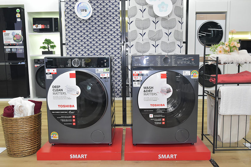 สำหรับเครื่องซักอบผ้า รุ่น TWD-T21BU115UWT(MG) ความจุซัก 10.5 กิโลกรัม และอบ 7 กิโลกรัม ตัวถังขนาดใหญ่ 510 มิลลิเมตร ทำให้แรงในการปั่นผ้ามากขึ้น ผ้ายับน้อยลง นอกจากถังใหญ่แล้ว ช่องใส่ผ้ายังกว้างถึง 330 มิลลิเมตร ช่วยให้ใส่ผ้านวมสะดวกมากขึ้น และสามารถมอนิเตอร์การทำงานผ่านมือถือได้ ดูโปรแกรมการซัก รอบการซักได้ ผ่านแอปพลิเคชัน TSmartLife ส่วนในเรื่องการทำความสะอาด มาพร้อมเทคโนโลยี Ultra Fine Bubble ที่จะปล่อยประจุไฟฟ้า สร้างฟองที่ละเอียดและเล็กกว่าเดิม ช่วยแทรกซึมเข้าสู่เส้นใยผ้า ขจัดคราบได้ดียิ่งขึ้น โดยเฉพาะคราบมัน คราบเหลืองของปกคอเสื้อ ช่วยให้ผ้าเหมือนใหม่อยู่เสมอ และไฮไลท์ที่สำคัญอีกตัวคือ Aroma+ เพราะเราให้ความสำคัญกับเรื่องกลิ่นหอม เราจึงพัฒนาโปรแกรมเพิ่มระยะเวลาการปรับผ้านุ่มให้ยาวขึ้น เพื่อช่วยให้ผ้าหอมยาวนานกว่าปกติ ท้ายสุด มีการดีไซน์วาล์วน้ำเข้าแบบใหม่ ที่ช่วยแก้ปัญหาพื้นที่ที่มีแรงดันน้ำน้อย ให้ยังคงสามารถใช้งานได้ จากคุณสมบัติดังกล่าว ทำให้ครึ่งปีแรก เครื่องซักผ้าโตชิบากลุ่มขนาด 10 กิโลกรัม ได้รับความนิยมเป็นอย่างสูง มียอดขายขึ้นมาเป็นอันดับ 1 ของประเทศ จึงเป็นที่มาของการเปิดตัวเครื่องซักอบรุ่นนี้ ซึ่งจะมีคุณสมบัติทั้งหมดข้างต้น และเพิ่มเติมตัวเซนเซอร์ SenseDry ที่จะช่วยมอนิเตอร์เรื่องความชื้น รักษาระดับความชื้นในผ้าให้เหมาะสมเพื่อควบคุมไม่ให้ผ้าแห้งเกินไป