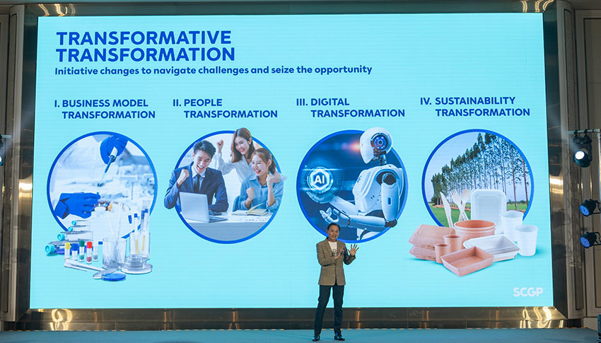 “วิชาญ จิตร์ภักดี” ประธานเจ้าหน้าที่บริหาร บริษัทเอสซีจี แพคเกจจิ้ง จำกัด (มหาชน) หรือ SCGP เปิดประเด็นว่า โลกกำลังเปลี่ยนแปลงอย่างรวดเร็ว หากธุรกิจไม่ปรับตัวจะไม่สามารถแข่งขันได้ ซึ่ง SCGP ได้ปรับตัวมาอย่างต่อเนื่อง โดยเฉพาะ Sustainability Transformation ถือเป็นดีเอ็นเอของเอสซีจี โดย SCGP ตั้งเป้าหมายลดการปล่อยก๊าซเรือนกระจกลง 25% ภายในปี 2030 และ Net Zero ภายในปี 2050 ผ่านการดำเนินงานใน 2 ด้านหลัก ได้แก่ การประเมินคาร์บอนฟุตพริ้นท์ขององค์กรหรือ CFO (Carbon Footprint for Organization) หันมาใช้พลังงานเชื้อเพลิงที่ปล่อยก๊าซคาร์บอนไดออกไซด์ต่ำ โดยติดตั้งโซลาร์รูฟ และใช้พลังงานชีวมวลแทนพลังงานถ่านหิน นำเทคโนโลยีปัญญาประดิษฐ์เข้ามาเพิ่มประสิทธิภาพเพื่อใช้พลังงานน้อยลงและสามารถลดการปล่อยก๊าซเรือนกระจก 1 ล้านตัน ปลูกต้นไม้สะสมจำนวน 2.3 ล้านต้น นำขยะพลาสติกมาหลอมเป็นเมล็ดพลาสติกใหม่ นำเศษเยื่อกระดาษจากกระบวนการผลิตไปทำสารปรับปรุงดิน 24,000 ตันต่อปี เพื่อนำไปปลูกต้นยูคาลิปตัสสำหรับผลิตกระดาษต่อไป