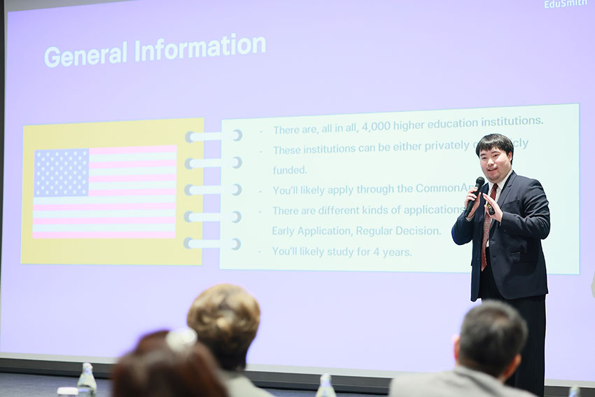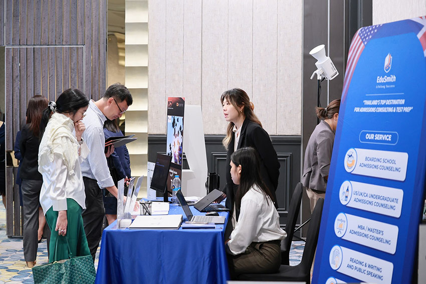 นายพีรกานต์ กาญจนพิมลกุล ที่ปรึกษาด้านกลยุทธ์การเตรียมใบสมัครจาก EduSmith กล่าวว่า สถาบันมีความเชี่ยวชาญในการวางแผนการศึกษาให้กับนักเรียนทั้งในระดับไฮสคูล ปริญญาตรี ปริญญาโท ปริญญาเอก และบอร์ดดิงสคูล พร้อมที่จะให้คำแนะนำกับลูกค้าที่สนใจส่งบุตรหลานไปศึกษาต่อต่างประเทศ ไม่ว่าจะเป็นสหรัฐอเมริกา ยุโรป อังกฤษ แคนาดา ฮ่องกง สิงคโปร์ และญี่ปุ่น เป็นต้น สำหรับน้อง ๆ ที่สอบติด TOP 50-70 มหาวิทยาลัยชื่อดังของสหรัฐฯ จาก 4,000 แห่ง ซึ่งปัจจุบันร้อยละ 95 จะรับสมัครผ่าน Common App โดยเฉลี่ยการศึกษาต่อในมหาวิทยาลัยของสหรัฐฯ จะใช้ระยะเวลา 4 ปี ซึ่งในแต่ละปี โควตาการเปิดรับสมัครของมหาวิทยาลัยไม่ได้ลดลงแต่อย่างใด แต่จำนวนผู้สมัครนั้นเพิ่มขึ้นในทุกปี โดยประเทศที่ส่งใบสมัครมาสูงสุดเป็นอันดับต้น ๆ ได้แก่ จีน อินเดีย และประเทศในแถบแอฟริกา สิ่งที่ใช้ในการรับสมัครคือเกรดเฉลี่ยและคะแนนวัดระดับภาษาอังกฤษ ซึ่งคำถามในการเขียนเรียงความที่ต้องเจอและตอบให้ได้คือ ทำไมอยากเรียนเมเจอร์นี้ที่มหาวิทยาลัยนี้ นับเป็นการเพิ่มความยากและเป็นตัวบังคับให้ต้องทำ School Research สิ่งสำคัญคือการค้นหาตัวตนว่าตนเองชื่นชอบสิ่งใด มีการทำกิจกรรมหรือชมรมอย่างต่อเนื่องที่สามารถเชื่อมโยงกับสาขาวิชาที่ต้องการลงทะเบียนเรียนได้ เพื่อให้มหาวิทยาลัยเห็นถึงความมุ่งมั่นและความคิดริเริ่มรวมถึงการมีภาวะผู้นำ โดยมี 10 กิจกรรมที่ผู้สมัครจะต้องเขียนอธิบายให้ครบใน 150 คาแรกเตอร์ ขณะที่มหาวิทยาลัยชื่อดังของ UK ใช้ระยะเวลาเรียน 3 ปี ซึ่งผู้สมัครจะต้องเลือกวิชาเมเจอร์ก่อนเข้าไปเรียน และแนวโน้มเทรนด์เด็กอินเตอร์สมัครเพิ่มขึ้นทุกปี โดยประเทศที่สมัครสูงสุดเป็นอันดับต้น ๆ ได้แก่ จีน อินเดีย สหรัฐฯ ไนจีเรีย การเตรียม Portfolio คือสิ่งที่ควรจะมีก่อนสมัครเข้ามหาวิทยาลัย และสิ่งที่ผู้สมัครควรตอบได้คือ ตนเองมีความเก่งและเชี่ยวชาญด้านไหน ไม่ว่าจะเป็น ดนตรี กีฬา การเขียน ธรรมชาติ ศิลปะ วิชาการ หรือภาวะผู้นำ นอกจากนี้ การจัดทำ SDG Goal (Sustainable Development Goals) เป็นเรื่องที่สำคัญ จากทั้งหมด 17 SDG Goal โดย 3 สิ่งที่ต้องตอบให้ได้เมื่อเริ่มโครงการนั้นคือ 1. คุณเก่งด้านไหน 2. คุณควรจะกล่าวถึงเรื่องอะไร และ 3. เป้าหมายของคุณคืออะไร โดยสามารถแบ่งโครงการออกเป็น 4 รูปแบบ ได้แก่ 1. โครงการที่สร้างให้เกิดการเรียนรู้ถึงการเปลี่ยนแปลงพฤติกรรมของผู้อื่น 2. โครงการที่ใช้ความคิดสร้างสรรค์ในการแก้ไขปัญหาผ่านการบริการชุมชน/การเป็นอาสาสมัคร 3. โครงการที่มีการสนับสนุนและสร้างให้เกิดการเปลี่ยนแปลงเชิงนโยบาย/กฎหมาย 4. โค