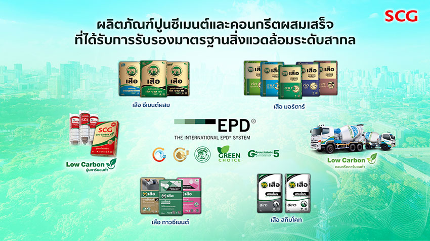 สำหรับผลิตภัณฑ์ปูนซีเมนต์ เอสซีจี ยังได้รับการรับรองมาตรฐานสิ่งแวดล้อมระดับสากล (Environmental Product Declaration - EPD) ในทุกกลุ่มผลิตภัณฑ์ โดยเฉพาะผลิตภัณฑ์ปูนซีเมนต์สำเร็จรูปเสือมอร์ตาร์ ถือเป็นรายแรก ครอบคลุมปูนมอร์ตาร์ 10 ผลิตภัณฑ์ ปูนซีเมนต์เอสซีจีและเสือ รวม 8 ผลิตภัณฑ์ และคอนกรีตผสมเสร็จซีแพค 27 ผลิตภัณฑ์ (คอนกรีตผสมเสร็จ จะได้รับการรับรองในเดือน พ.ย. 2567)