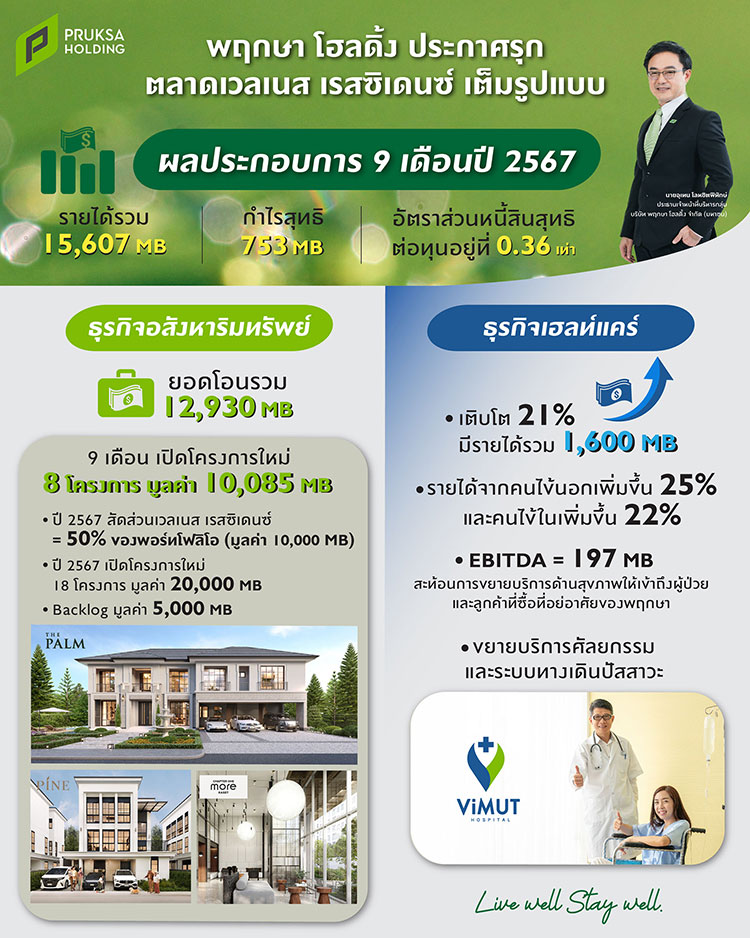 นายอุเทน โลหชิตพิทักษ์ ประธานเจ้าหน้าที่บริหารกลุ่ม บริษัท พฤกษา โฮลดิ้ง จำกัด (มหาชน) หรือ PSH กล่าวถึงการดำเนินงานของบริษัทฯ ว่า ในช่วง 9 เดือนที่ผ่านมาบริษัทฯ มีรายได้รวม 15,607 ล้านบาท ลดลง 22% จากช่วงเดียวกันของปีก่อน เนื่องจากสภาวะเศรษฐกิจและการอนุมัติสินเชื่อที่เข้มงวดมากขึ้น โดยเฉพาะในกลุ่มลูกค้าที่มีความเปราะบาง อย่างไรก็ตาม บริษัทฯ สามารถรักษากำไรขั้นต้นที่ 5,118 ล้านบาท คิดเป็นอัตรากำไรขั้นต้น 32.8% จากการใช้กลยุทธ์ด้านราคาที่ช่วยดึงดูดความสนใจของผู้บริโภคในช่วงที่ตลาดอสังหาริมทรัพย์ยังซบเซา ในขณะเดียวกัน ธุรกิจเฮลท์แคร์ของพฤกษายังคงสร้างผลกำไรที่ดีอย่างต่อเนื่อง ช่วยเสริมฐานรายได้ของบริษัทฯ ในภาพรวม