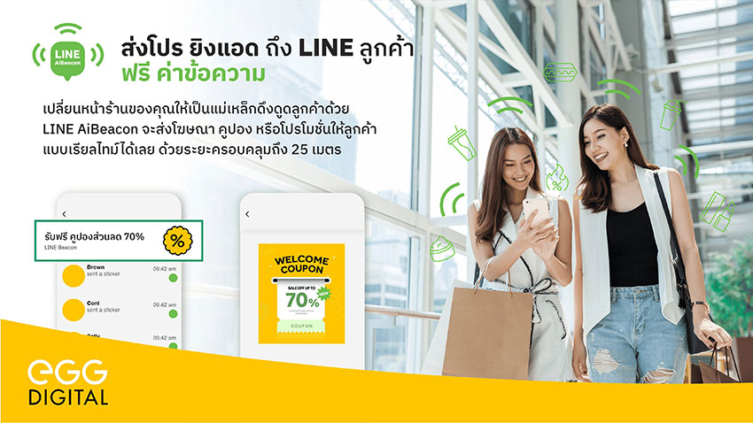 - ด้านการบริการลูกค้าอัจฉริยะ (Smart Customer Service) ในยุคที่ผู้คนเริ่มกลับมาใช้จ่ายและออกมาชอปปิงมากขึ้น ธุรกิจ SME ที่มีหน้าร้านหรือสาขา ควรสร้างประสบการณ์ที่ไร้รอยต่อระหว่างออนไลน์และออฟไลน์ให้กับลูกค้า เพื่อสร้างความสัมพันธ์กับลูกค้าและดึงดูดให้มาที่ร้าน ซึ่งโซลูชันที่อยากแนะนำคือ LINE AiBeacon โซลูชันนี้สามารถส่งข้อความ โปรโมชัน หรือข้อมูลต่าง ๆ แบบเฉพาะบุคคลได้อย่างเรียลไทม์เมื่อลูกค้าอยู่ใกล้พื้นที่ของร้าน ช่วยดึงดูดลูกค้าเข้าหน้าร้าน สร้างประสบการณ์ที่ดีด้วยการสื่อสารแบบ O2O (Online and Offline) พร้อมกระตุ้นการซื้อได้อย่างมีประสิทธิภาพ