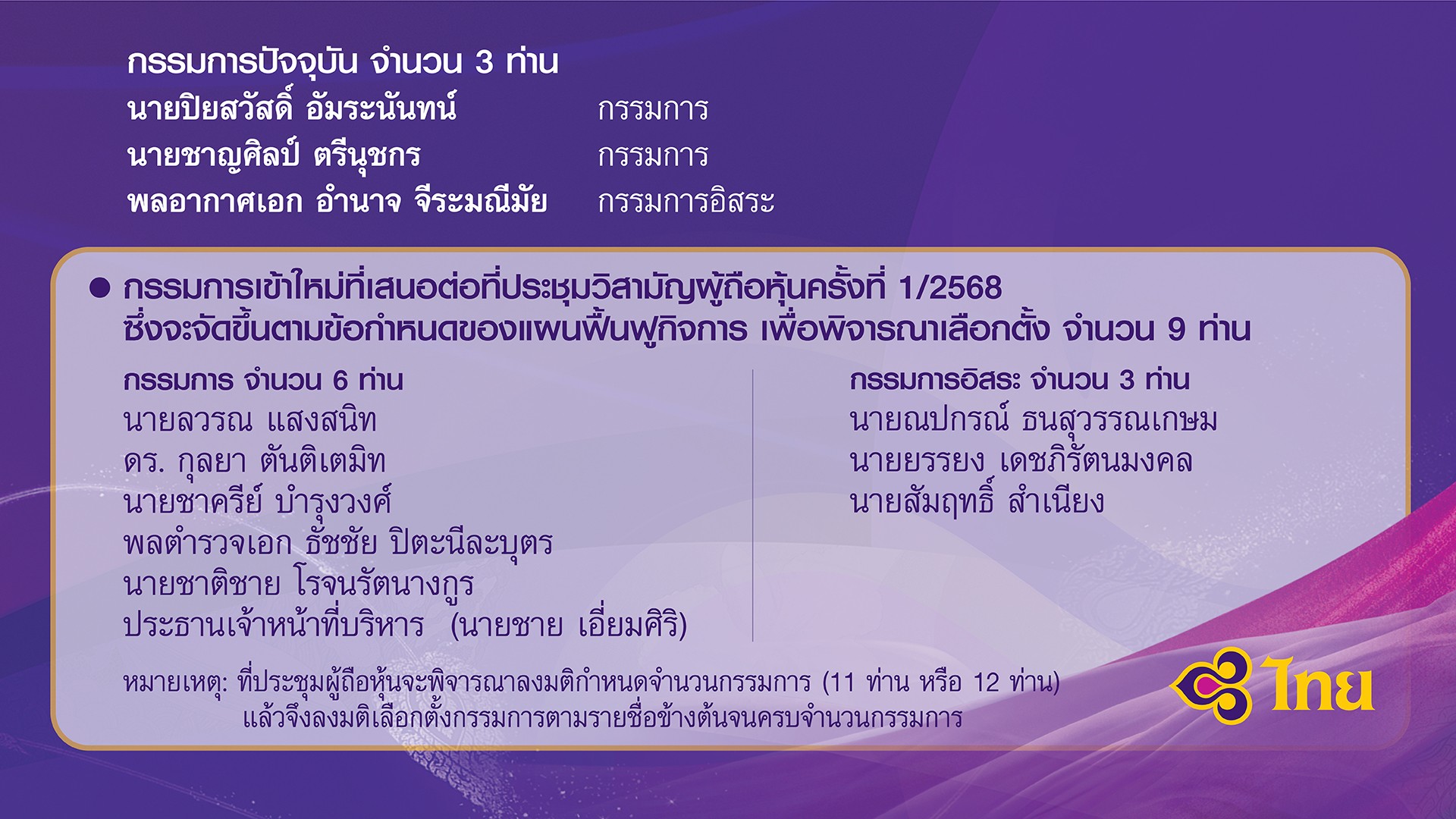 สำหรับการดำเนินการตามแผนฟื้นฟูกิจการในขั้นตอนถัดไป ที่ประชุมคณะผู้บริหารแผนดำเนินการเพื่อบรรลุเงื่อนไขผลสำเร็จของแผนฟื้นฟูกิจการข้อสุดท้าย โดยได้มีมติเรียกประชุมวิสามัญผู้ถือหุ้นซึ่งจะจัดขึ้นตามข้อกำหนดของแผนฟื้นฟูกิจการในวันศุกร์ที่ 18 เมษายน 2568 และกำหนดวันกำหนดรายชื่อผู้ถือหุ้นที่มีสิทธิเข้าร่วมประชุมและออกเสียงในที่ประชุมวิสามัญผู้ถือหุ้น (Record Date) เป็นวันศุกร์ที่ 14 มีนาคม 2568 เพื่อพิจารณาอนุมัติกำหนดจำนวนกรรมการบริษัท จำนวน 11 ท่านหรือ 12 ท่าน ซึ่งประกอบด้วยกรรมการในปัจจุบันจำนวน 3 ท่าน ได้แก่ นายปิยสวัสดิ์ อัมระนันทน์ นายชาญศิลป์ ตรีนุชกร และพลอากาศเอก อำนาจ จีระมณีมัย และกรรมการเข้าใหม่จำนวน 8 ท่านหรือ 9 ท่าน (ตามแต่จำนวนกรรมการที่ที่ประชุมผู้ถือหุ้นลงมติอนุมัติ) โดยรายนามกรรมการเข้าใหม่ที่เสนอต่อที่ประชุมผู้ถือหุ้นเพื่อพิจารณาเลือกตั้งประกอบด้วยกรรมการจำนวน 6 ท่าน ได้แก่ นายลวรณ แสงสนิท ดร. กุลยา ตันติเตมิท นายชาครีย์ บำรุงวงศ์ พลตำรวจเอก ธัชชัย ปิตะนีละบุตร นายชาติชาย โรจน์รัตนางกูร และนายชาย เอี่ยมศิริ และกรรมการอิสระจำนวน 3 ท่าน ได้แก่ นายณปกรณ์ ธนสุวรรณเกษม นายยรรยง เดชภิรัตนมงคล และนายสัมฤทธิ์ สำเนียง ทั้งนี้ ภายหลังจากบริษัทฯ ได้รับมติอนุมัติจากที่ประชุมวิสามัญผู้ถือหุ้นแล้ว และได้รับอนุญาตจากศาลล้มละลายกลางแล้ว บริษัทฯ จะดำเนินการจดทะเบียนการเปลี่ยนแปลงจำนวนกรรมการ และการแต่งตั้งจดทะเบียนกรรมการใหม่ ก่อนที่จะดำเนินการยื่นคำร้องต่อศาลล้มละลายกลางเพื่อขอยกเลิกการฟื้นฟูกิจการต่อไป