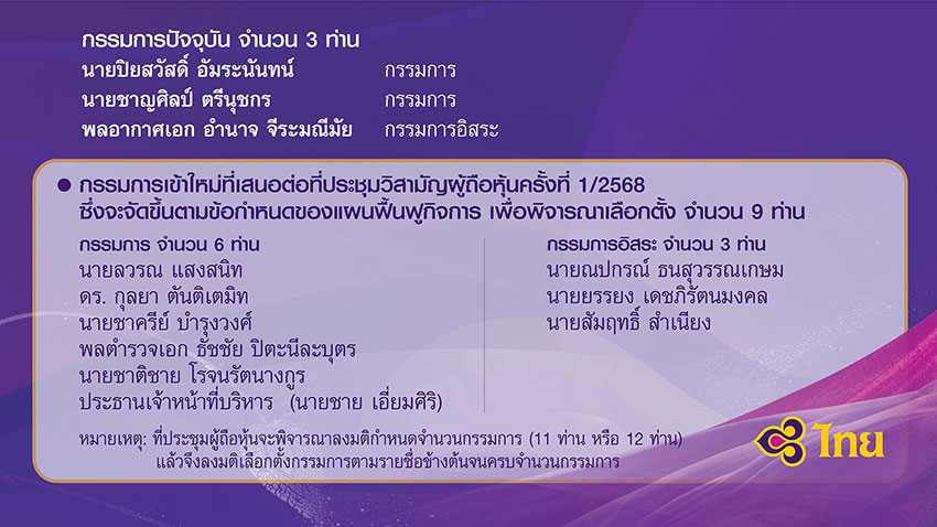 สำหรับการดำเนินการตามแผนฟื้นฟูกิจการในขั้นตอนถัดไป ที่ประชุมคณะผู้บริหารแผนดำเนินการเพื่อบรรลุเงื่อนไขผลสำเร็จของแผนฟื้นฟูกิจการข้อสุดท้าย โดยได้มีมติเรียกประชุมวิสามัญผู้ถือหุ้นซึ่งจะจัดขึ้นตามข้อกำหนดของแผนฟื้นฟูกิจการในวันศุกร์ที่ 18 เมษายน 2568 และกำหนดวันกำหนดรายชื่อผู้ถือหุ้นที่มีสิทธิเข้าร่วมประชุมและออกเสียงในที่ประชุมวิสามัญผู้ถือหุ้น (Record Date) เป็นวันศุกร์ที่ 14 มีนาคม 2568 เพื่อพิจารณาอนุมัติกำหนดจำนวนกรรมการบริษัท จำนวน 11 ท่านหรือ 12 ท่าน ซึ่งประกอบด้วยกรรมการในปัจจุบันจำนวน 3 ท่าน ได้แก่ นายปิยสวัสดิ์ อัมระนันทน์ นายชาญศิลป์ ตรีนุชกร และพลอากาศเอก อำนาจ จีระมณีมัย และกรรมการเข้าใหม่จำนวน 8 ท่านหรือ 9 ท่าน (ตามแต่จำนวนกรรมการที่ที่ประชุมผู้ถือหุ้นลงมติอนุมัติ) โดยรายนามกรรมการเข้าใหม่ที่เสนอต่อที่ประชุมผู้ถือหุ้นเพื่อพิจารณาเลือกตั้งประกอบด้วยกรรมการจำนวน 6 ท่าน ได้แก่ นายลวรณ แสงสนิท ดร. กุลยา ตันติเตมิท นายชาครีย์ บำรุงวงศ์ พลตำรวจเอก ธัชชัย ปิตะนีละบุตร นายชาติชาย โรจน์รัตนางกูร และนายชาย เอี่ยมศิริ และกรรมการอิสระจำนวน 3 ท่าน ได้แก่ นายณปกรณ์ ธนสุวรรณเกษม นายยรรยง เดชภิรัตนมงคล และนายสัมฤทธิ์ สำเนียง ทั้งนี้ ภายหลังจากบริษัทฯ ได้รับมติอนุมัติจากที่ประชุมวิสามัญผู้ถือหุ้นแล้ว และได้รับอนุญาตจากศาลล้มละลายกลางแล้ว บริษัทฯ จะดำเนินการจดทะเบียนการเปลี่ยนแปลงจำนวนกรรมการ และการแต่งตั้งจดทะเบียนกรรมการใหม่ ก่อนที่จะดำเนินการยื่นคำร้องต่อศาลล้มละลายกลางเพื่อขอยกเลิกการฟื้นฟูกิจการต่อไป