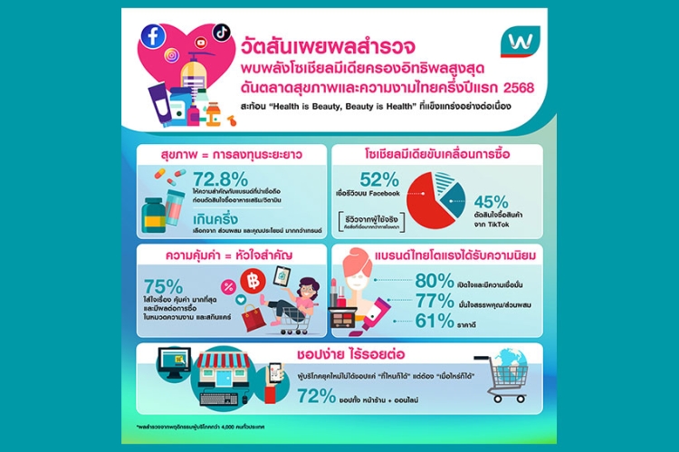 ในยุคที่พฤติกรรมผู้บริโภคเปลี่ยนแปลงอย่างรวดเร็ว การดูแลสุขภาพไม่ใช่เพียงเทรนด์ชั่วคราว แต่กลายเป็นไลฟ์สไตล์หลักของคนรุ่นใหม่ที่มองการลงทุนในสุขภาพเป็นรากฐานของความสุขที่ยั่งยืน วัตสัน ผู้นำอันดับหนึ่งในวงการร้านค้าเพื่อสุขภาพและความงามของไทย เปิดเผยผลสำรวจที่สะท้อนพฤติกรรมผู้บริโภคกว่า 4,000 คนทั่วประเทศเผยให้เห็นจุดเปลี่ยนสำคัญที่ขับเคลื่อนตลาดสุขภาพและความงามในปัจจุบัน