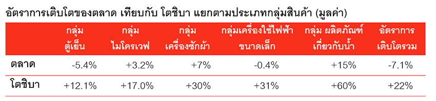 ความสำเร็จดังกล่าว ที่ทำให้โตชิบาเติบโตถึง 22% เกิดจากการที่ผู้บริโภคตอบรับสินค้าโตชิบาในกลุ่มที่พรีเมียมยิ่งขึ้น โดยเฉพาะกลุ่มตู้เย็นมัลติดอร์ ซึ่งมีอัตราเติบโตเพิ่มขึ้นถึง 60% เครื่องซักผ้าฝาหน้า เพิ่มขึ้น 61% หม้อหุงข้าว เพิ่มขึ้น 11% ไมโครเวฟ เพิ่มขึ้น 17% พัดลม เพิ่มขึ้น 166% และเครื่องทำน้ำอุ่น เพิ่มขึ้น 60% นอกจากนี้ ยังเป็นปีที่บริษัทฯ สามารถทำยอดขายรวมได้สูงถึง 2.4 ล้านเครื่องต่อปี