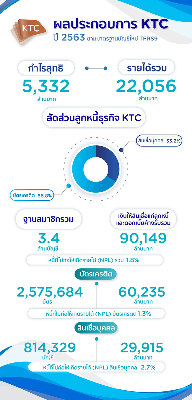 ผลประกอบการของเคทีซี ณ วันที่ 31 ธันวาคม 2563 ภายใต้มาตรฐาน TFRS9 เปรียบเทียบกับปี 2562 มีดังนี้ กำไรสุทธิ 5,332 ล้านบาท (ปี 2562 เท่ากับ 5,524) เงินให้สินเชื่อแก่ลูกหนี้และดอกเบี้ยค้างรับรวมเท่ากับ 90,149 ล้านบาท (เติบโต 4.3%) NPL ต่อเงินให้สินเชื่อรวมเท่ากับ 1.8% ฐานสมาชิกรวม 3.4 ล้านบัญชี (ใกล้เคียงปี 2562) แบ่งเป็นธุรกิจบัตรเครดิต 2,575,684 บัตร (เพิ่มขึ้น 2.6%) สินเชื่อลูกหนี้บัตรเครดิตรวม 60,235 ล้านบาท อัตราเติบโตของปริมาณการใช้จ่ายผ่านบัตรเครดิตลดลงที่ -7.7% หรือมีมูลค่ารวม 197,087 ล้านบาท NPL ต่อเงินให้สินเชื่อลูกหนี้บัตรเครดิต 1.3% ธุรกิจสินเชื่อบุคคล (รวมสินเชื่อธนวัฏและสินเชื่อเจ้าของกิจการ) มีจำนวนทั้งสิ้น 814,329 บัญชี (ลดลง -8.3%) จากการปิดบัญชีที่ไม่เคลื่อนไหว ยอดลูกหนี้สินเชื่อบุคคลรวม 29,915 ล้านบาท NPL ต่อเงินให้สินเชื่อลูกหนี้สินเชื่อบุคคลเท่ากับ 2.7%