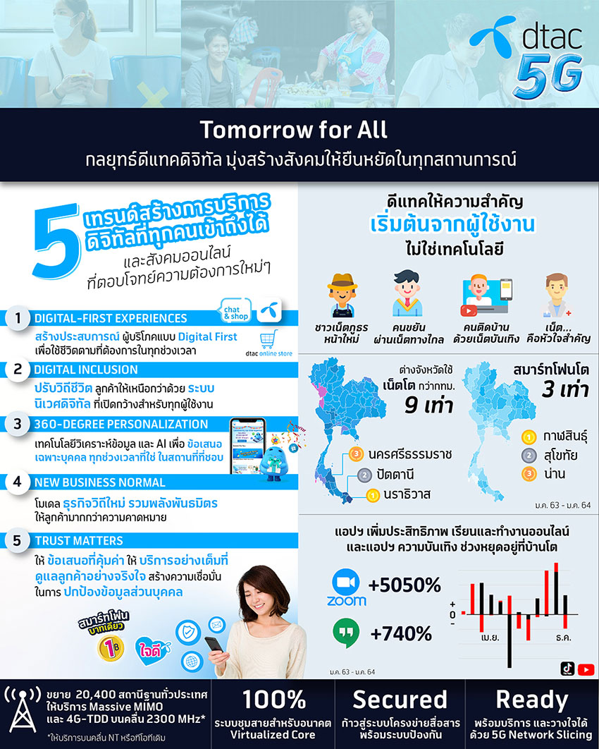 ตอบโจทย์ปีแห่งการเปลี่ยนแปลงและความท้าทายใหม่ๆ ในอนาคต ดีแทคประกาศขยายให้บริการ 5G และ 4G อย่างต่อเนื่อง ตอบสนองความต้องการเฉพาะที่แตกต่างไปในแต่ละกลุ่มผู้ใช้งาน และแนวโน้มการใช้งานดาต้าในต่างจังหวัดที่เติบโตกว่ากรุงเทพฯ 9 เท่า และเร่งรุกบริการดิจิทัลให้ครอบคลุมผู้ใช้งานทุกกลุ่ม