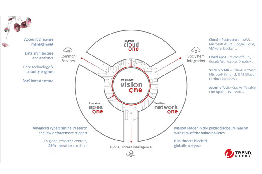 แพลตฟอร์ม Trend Micro Vision One ประกอบด้วยระบบการรักษาความปลอดภัย 3 ส่วนหลัก ได้แก่ Cloud One ที่ดูแลความปลอดภัยให้กับระบบคลาวด์แบบไฮบริดคลาวด์ APEX One ดูแลความปลอดภัยของผู้ใช้งาน และ Network One ซึ่งดูแลความปลอดภัยให้กับระบบเครือข่ายทั้งหมดในองค์กร