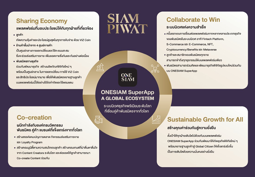 - Sustainable Growth for All จากพันธกิจของสยามพิวรรธน์ ที่ตั้งเป้าให้ทุกฝ่ายสามารถเติบโตไปด้วยกันได้บนแพลตฟอร์ม ONESIAM SuperApp เป็นการเปิดโลกใหม่ของการทำธุรกิจดิจิทัลที่ทลายทุกข้อจำกัด ส่งผลให้เกิดการขยายธุรกิจอย่างรวดเร็ว และขยายฐานลูกค้าซึ่งกันและกันระหว่างพันธมิตร มีโอกาสที่จะร่วมกันพัฒนาให้เกิดธุรกิจดิจิทัลใหม่ ๆ ได้อย่างไร้ข้อจำกัด และขยายฐานลูกค้าสู่ Global Citizen ให้แข็งแกร่งยิ่งขึ้น เป็นการเติบโตด้วยความมั่นคงอย่างยั่งยืน