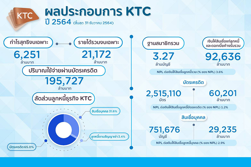 “สำหรับผลประกอบการของเคทีซี ณ วันที่ 31 ธันวาคม 2564 บริษัทฯ มีเงินให้สินเชื่อแก่ลูกหนี้และดอกเบี้ยค้างรับรวม 92,636 ล้านบาท เพิ่มขึ้นจากปีก่อนหน้า 2.8% ส่วนปริมาณการใช้จ่ายผ่านบัตรเครดิตทั้งปีอยู่ที่ 195,727 ล้านบาท ลดลง -0.7% รายได้รวม 21,442 ล้านบาท ลดลง -2.8% รายได้ดอกเบี้ยลูกหนี้บัตรเครดิตและลูกหนี้สินเชื่อบุคคลที่ลดลง จากการถูกปรับลดเพดานอัตราดอกเบี้ยของทั้งสองธุรกิจและผลกระทบจากการระบาดของโควิด-19 แต่ก็สามารถบริหารจัดการค่าใช้จ่ายรวมให้ลดลง -7.8% อยู่ที่ 14,197 ล้านบาท โดยค่าใช้จ่ายทางการเงิน และผลขาดทุนด้านเครดิตที่คาดว่าจะเกิดขึ้นลดลงในอัตรา -7.7% และ -17.4% ตามลำดับ และยังมีอัตรารายได้หนี้สูญที่ได้รับคืนเพิ่มขึ้น 4.7% อัตราส่วนหนี้ที่ไม่ก่อให้เกิดรายได้ (NPL) รวมลดลงที่ 3.6% จาก 3.8% ในไตรมาส 3”