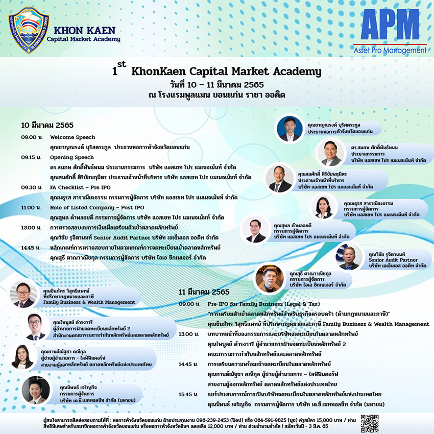 คุณสมศักดิ์ ศิริชัยนฤมิตร ประธานเจ้าหน้าที่บริหาร บริษัท แอสเซท โปร แมเนจเม้นท์ จำกัด ในฐานะที่ปรึกษาทางการเงินหอการค้าจังหวัดขอนแก่น เปิดเผยว่า ทาง APM ได้ช่วยพัฒนาหลักสูตร KhonKaen Capital Market Academy เพื่อให้บริษัทที่มีความสนใจในการเข้าจดทะเบียนในตลาดหลักทรัพย์ได้เตรียมตัว โดยได้รับเกียรติจากคุณไพบูลย์ ดำรงวารี ผู้อำนวยการฝ่ายจดทะเบียนหลักทรัพย์ 2 คณะกรรมการกํากับหลักทรัพย์และตลาดหลักทรัพย์ (ก.ล.ต.) ที่จะมาบรรยายบทบาทหน้าที่ของกรรมการและบริษัทจดทะเบียนในตลาดหลักทรัพย์ และคุณกานต์ณัฐชา คณีกุล ผู้ช่วยผู้อำนวยการ – ไลฟ์ฟินคอร์ฟ สายงานผู้ออกหลักทรัพย์ ตลาดหลักทรัพย์แห่งประเทศไทย (ตลท.) ที่จะมาเปิดเผยข้อมูลการเตรียมความพร้อมเข้าจดทะเบียนในตลาดหลักทรัพย์