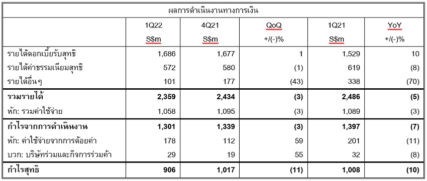 รายได้ค่าธรรมเนียมรวมไม่เปลี่ยนแปลงเมื่อเทียบกับไตรมาสก่อน แม้ค่าธรรมเนียมที่เกี่ยวเนื่องกับสินเชื่อจะพุ่งสูงเป็นประวัติการณ์ โดยมีอัตราเติบโตที่ร้อยละ 14 เมื่อเทียบกับไตรมาสก่อน แต่ค่าธรรมเนียมจากบัตรเครดิต การบริหารจัดการความมั่งคั่ง และการบริหารจัดการกองทุนกลับลดลง เนื่องจากความอ่อนไหวของตลาด รายได้จากการค้าและการลงทุนลดลงเกินร้อยละ 10 เนื่องจากได้รับผลกระทบจากการป้องกันความเสี่ยงจากการที่อัตราดอกเบี้ยปรับตัวสูงขึ้น ส่งผลให้รายได้รวมลดลงเล็กน้อยร้อยละ 3 อยู่ที่ 2.4 พันล้านเหรียญสิงคโปร์ดอลลาร์