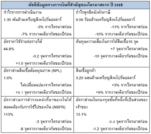 กลุ่มธนาคารประกาศผลกำไรสุทธิ 9.06 ร้อยล้านเหรียญสิงคโปร์ดอลลาร์ ลดลงร้อยละ 11 จากไตรมาสก่อน เนื่องจากความไม่แน่นอนด้านภูมิรัฐศาสตร์ส่งผลให้รายได้จากการค้าและการลงทุนที่ไม่เกี่ยวเนื่องกับลูกค้าปรับตัวลดลง ประกอบกับการลดลงของการโอนกลับเงินสำรองทั่วไป