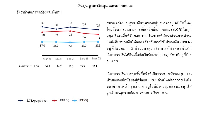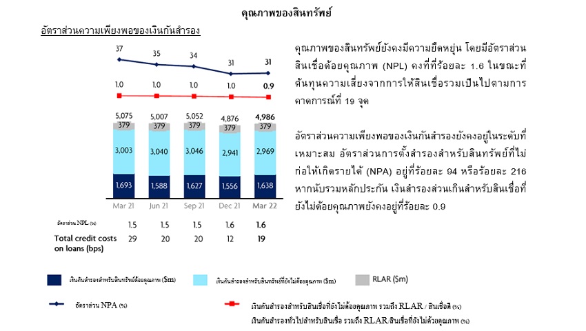 ต้นทุนความเสี่ยงจากการให้สินเชื่อ ณ สิ้นไตรมาสแรกปี 2565 กลับสู่ภาวะปกติที่ 19 จุด จากการเพิ่มขึ้นของการโอนกลับสำรองทั่วไป (general allowance write-back) ในไตรมาสก่อน คุณภาพของสินทรัพย์ของกลุ่มธนาคารและงบดุลยังคงมีความยืดหยุ่น สภาพคล่องอยู่ในระดับที่เหมาะสม และอัตราส่วนเงินกองทุนชั้นที่หนึ่งที่เป็นส่วนของเจ้าของ (CET1) อยู่ที่ร้อยละ 13.1