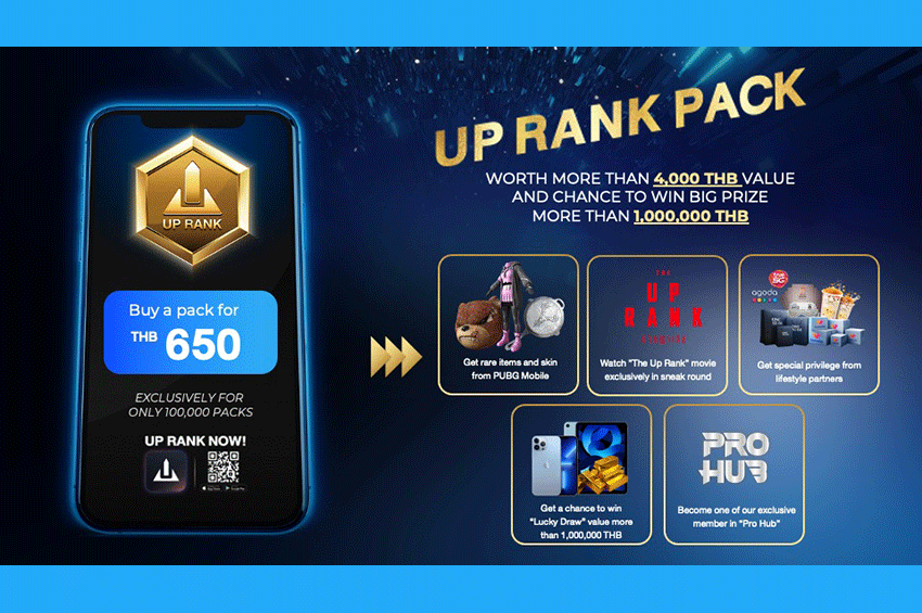 โดย UP RANK PACK เปิดขายในราคาเพียง 650 บาท จำกัดจำนวน 1 แสนแพ็ก ผู้ที่สนใจสามารถดาวน์โหลดและซื้อได้แล้ววันนี้ที่ Up Rank Application https://onelink.to/dzmuka โดยสามารถชำระเงินได้ทั้งรูปแบบของบัตรเครดิต Promptpay และ Mobile Banking”