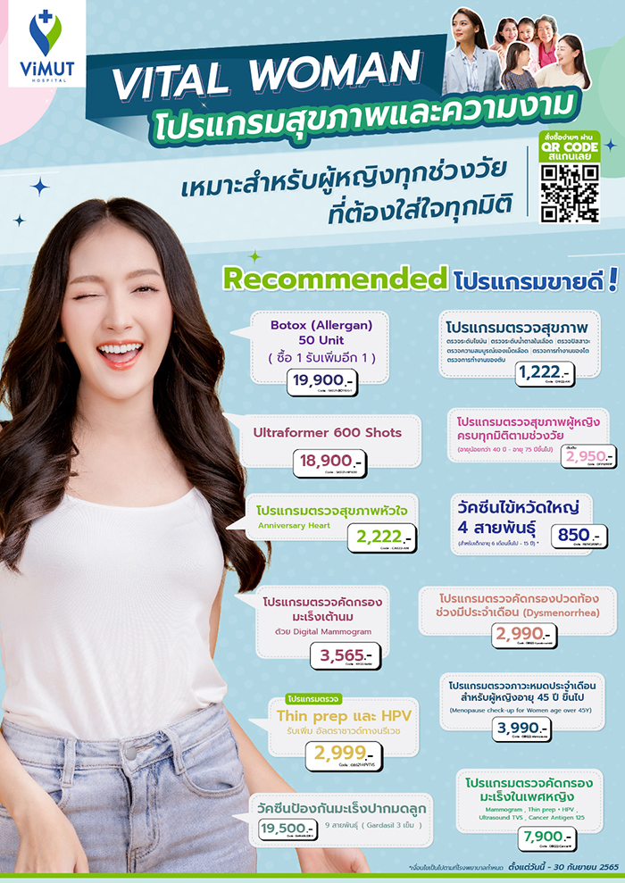 รุกตลาดสุขภาพสตรีเต็มรูปแบบด้วยแพ็กเกจการตรวจร่างกายของคุณผู้หญิงในทุกระดับอายุ โดยสามารถเลือกโปรแกรมที่เหมาะกับไลฟ์สไตล์และความเสี่ยงของแต่ละบุคคลได้ในราคาพิเศษ เริ่มต้นเพียง 1,222 บาท ตั้งแต่วันนี้ถึง 30 กันยายน 2565 รพ.วิมุตเชื่อมั่นว่าแคมเปญ “VITAL WOMAN” ตอบโจทย์ผู้หญิงยุคใหม่ในแต่ละวัยได้ตรงจุด ด้วยกระบวนการวินิจฉัยเชิงลึกที่มีประสิทธิภาพมากกว่าแพ็กเกจการตรวจทั่วไป โดยเฉพาะหลังช่วงการแพร่ระบาดของโควิดที่ทุกคนหันมาใส่ใจสุขภาพมากขึ้น คาดได้ผลตอบรับดีเยี่ยมทั้งจากชาวไทยและชาวต่างชาติที่อาศัยอยุ่ในประเทศ