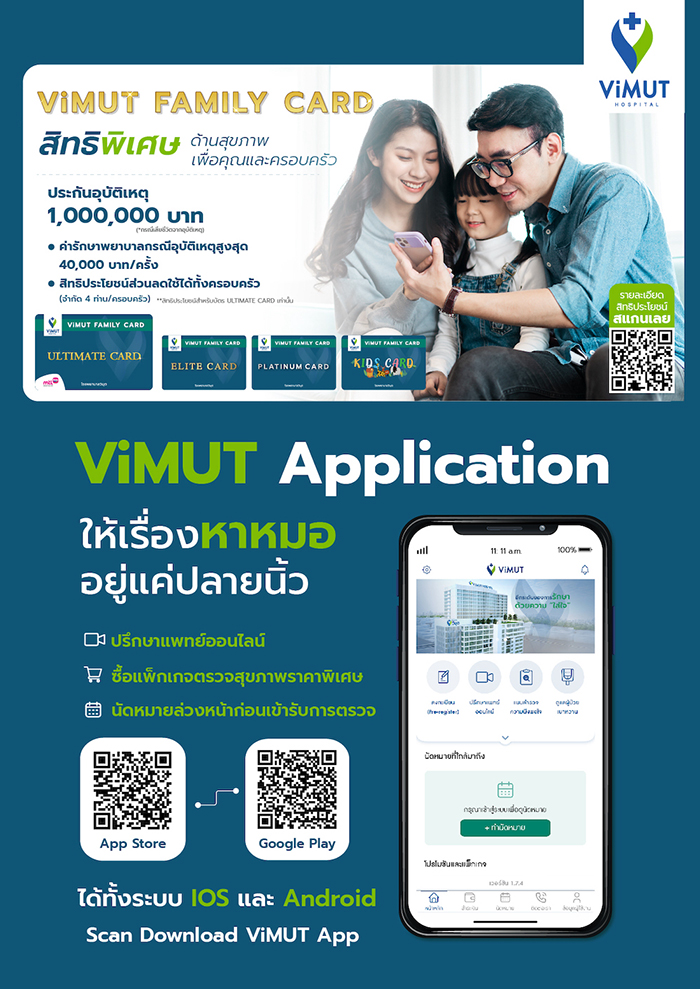 สามารถติดตามข่าวสารอื่นๆ ของทางโรงพยาบาล ได้ที่เว็บไซต์ www.vimut.com เฟซบุ๊ก: www.facebook.com/vimuthospital อินสตาแกรม: vimut_hospital ไลน์: @vimuthospital TikTok: @vimuthospital Youtube: www.youtube.com/c/ViMUTHospital หรือเบอร์ โทร. 02-079-0000