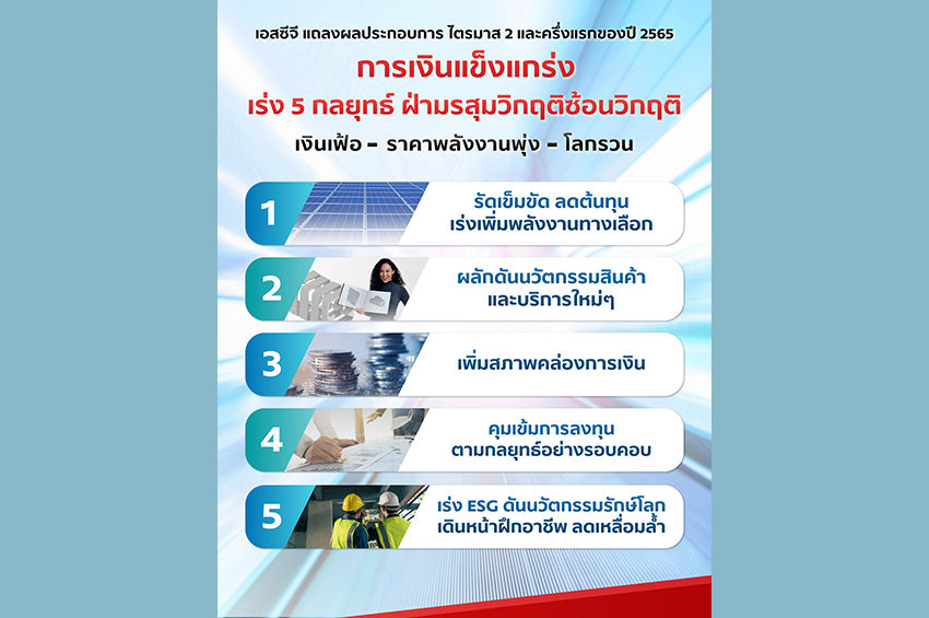 นายรุ่งโรจน์ กล่าวต่อว่า “สถานการณ์เศรษฐกิจโลกในปัจจุบันยังมีความไม่แน่นอนสูง เอสซีจีได้ติดตามอย่างใกล้ชิด และเร่งดำเนินการภายใต้ 5 กลยุทธ์ ประกอบด้วย 1.) ลดต้นทุน เพิ่มพลังงานทางเลือก 2.) พัฒนานวัตกรรม สินค้าและบริการที่มีมูลค่าเพิ่มใหม่ๆ ต่อเนื่อง 3.) เพิ่มสภาพคล่องการเงิน 4.) คุมเข้มการลงทุนตามกลยุทธ์อย่างรอบคอบ 5.) เดินหน้า ESG ด้วยแนวทาง ESG 4 Plus