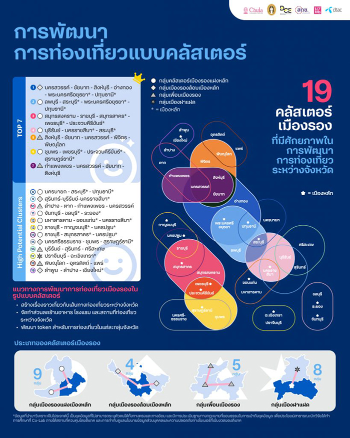 ทั้งนี้ จากผลการวิเคราะห์ mobility data สามารถแบ่งประเภทของคลัสเตอร์ของการท่องเที่ยวที่จังหวัดเมืองรองเป็นสมาชิกได้เป็น 4 รูปแบบ ดังนี้ 1) กลุ่มเมืองรองแฝงเมืองหลัก เป็นกลุ่มที่มีจังหวัดเมืองรองร่วมอยู่ด้วย แต่สมาชิกในกลุ่มโดยส่วนใหญ่เป็นเมืองท่องเที่ยวหลัก เช่น กลุ่มจังหวัดบุรีรัมย์-นครราชสีมา-สระบุรี 2) กลุ่มเมืองรองล้อมเมืองหลัก เป็นกลุ่มที่มีสมาชิกโดยส่วนใหญ่เป็นจังหวัดเมืองรองอยู่ร่วมกับจังหวัดที่เป็นเมืองท่องเที่ยวหลัก เช่น กลุ่มจังหวัดนครสวรรค์-ชัยนาท-สิงห์บุรี-อ่างทอง-พระนครศรีอยุธยา-ปทุมธานี 3) กลุ่มเพื่อนเมืองรอง เป็นกลุ่มจังหวัดที่มีสมาชิกทั้งหมดเป็นจังหวัดเมืองรอง เช่น กลุ่มจังหวัดลำปาง-ตาก-กำแพงเพชร-นครสรรค์ และ 4) กลุ่มเมืองฝาแฝด เป็นกลุ่มที่มีสมาชิกเพียง 2 จังหวัด โดยมีทั้งการจับคู่ระหว่างเมืองหลักกับเมืองรอง หรือระหว่างเมืองรองด้วยกันเอง เช่น จังหวัดปราจีนบุรี-ฉะเชิงเทรา
