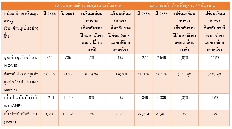 มูลค่าธุรกิจใหม่ (VONB) มีมูลค่า 741 ล้านเหรียญสหรัฐ เพิ่มขึ้นร้อยละ 7 เมื่อเทียบกับไตรมาส 3 ของปี 2564 ซึ่งเติบโตจากทุกส่วนงานที่รายงานผล ประกอบกับการเติบโตของทั้งช่องทางตัวแทนและพันธมิตร