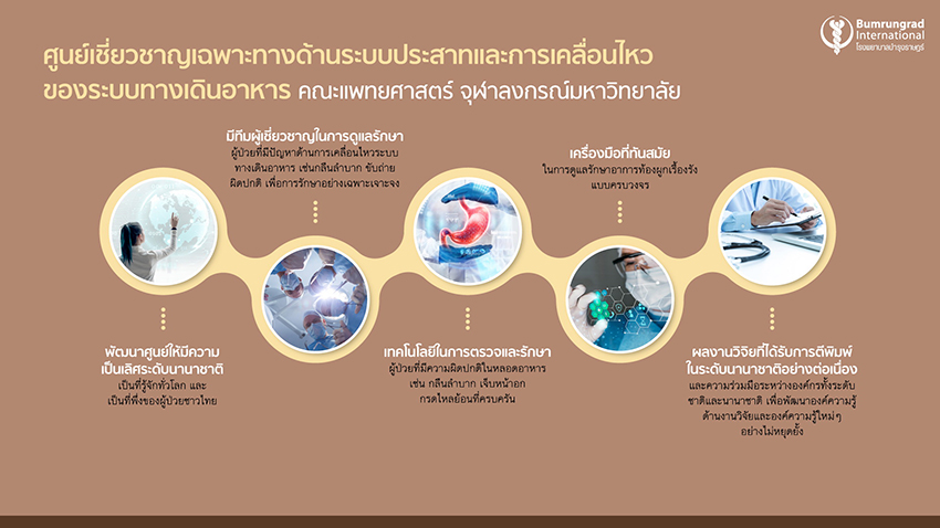 โดย ‘ศูนย์เชี่ยวชาญเฉพาะทางด้านระบบประสาทและการเคลื่อนไหวของระบบทางเดินอาหาร’ คณะแพทยศาสตร์ จุฬาลงกรณ์มหาวิทยาลัย เป็นศูนย์ความเป็นเลิศของโรงเรียนแพทย์ที่เดียวและเป็นอันดับหนึ่งในไทยที่ให้บริการตรวจและรักษาความผิดปกติของการทำงานของระบบทางเดินอาหาร เป็นสถาบันแห่งแรกที่ให้บริการรักษาผู้ป่วยได้อย่างครบวงจรด้วยเทคโนโลยีที่ทันสมัย เป็นสถาบันฝึกอบรมและผลิตแพทย์ รวมทั้งรับส่งต่อผู้ป่วยที่มีปัญหาซับซ้อน ตลอดจนมีการศึกษาวิจัยข้อมูลจากฐานผู้ป่วยเกี่ยวกับโรคทางเดินอาหารจำนวนมาก รวมถึงความใส่ใจของทีมแพทย์ที่ซักถามถึงรายละเอียดของอาการและพฤติกรรมของผู้ป่วย ทำให้เข้าใจถึงกลไกของการเกิดโรค และสามารถวางแผนการรักษาโรคได้อย่างมีประสิทธิภาพและตรงจุดมากขึ้น