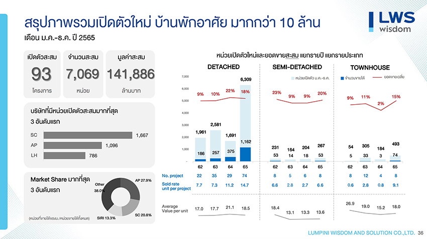 นายประพันธ์ศักดิ์ รักษ์ไชยวรรณ กรรมการผู้จัดการ บริษัท ลุมพินี วิสดอม แอนด์ โซลูชั่น จำกัด บริษัทวิจัยและพัฒนาอสังหาริมทรัพย์ในเครือบริษัท แอล.พี. เอ็น. ดีเวลลอปเมนท์ จำกัด (มหาชน) ระบุว่า ปัจจุบันความต้องการบ้านพักอาศัยที่ระดับราคาเกิน 10 ล้านบาท มีอัตราการเติบโตอย่างต่อเนื่อง โดยในปี 2565 มีการเปิดตัวโครงการบ้านพักอาศัยระดับราคาเกิน 10 ล้านบาทในเขตกรุงเทพฯ-ปริมณฑล ทั้งสิ้น 93 โครงการ จำนวน 7,077 หน่วย คิดเป็นสัดส่วน 13.7% ของจำนวนหน่วยเปิดตัวโครงการใหม่ของบ้านพักอาศัยทั้งหมดในเขตกรุงเทพฯ-ปริมณฑล จำนวน 51,660 หน่วย หรือคิดเป็นมูลค่าประมาณ 141,886 ล้านบาท คิดเป็นสัดส่วน 44% ของมูลค่าการเปิดตัวโครงการเปิดตัวใหม่ของโครงการบ้านพักอาศัยทั้งหมด 322,308 ล้านบาท มีอัตราการขายเฉลี่ย ณ วันเปิดตัวโครงการเฉลี่ยที่ 30%
