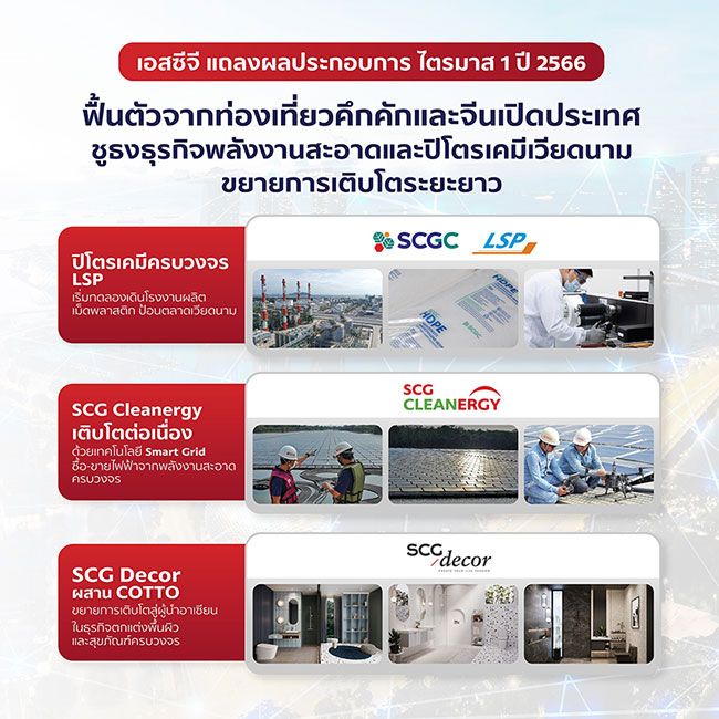 เอสซีจี เผยผลประกอบการ ไตรมาส 1 ปี 2566 เริ่มฟื้นตัวทุกกลุ่มธุรกิจ ยอดขายและกำไรเพิ่มขึ้น อานิสงส์จากการท่องเที่ยวกลับมาคึกคักและจีนเปิดประเทศ เร่งสร้างการเติบโตระยะยาว ด้วย SCG Cleanergy ธุรกิจพลังงานสะอาดครบวงจร โตต่อเนื่องตอบเทรนด์รักษ์โลก ปลื้มลดต้นทุนได้ดีจากใช้เชื้อเพลิงทดแทนและพลังงานแสงอาทิตย์เพิ่มขึ้น ปิโตรเคมีครบวงจร LSP เริ่มทดลองเดินโรงงาน ผลิตเม็ดพลาสติกสู่ตลาดใหญ่ในเวียดนาม