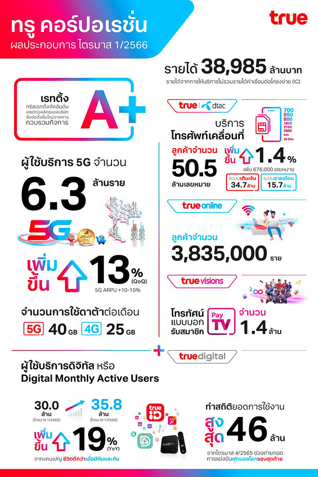ในไตรมาสที่ 1 ปี 2566 ผู้ใช้บริการมือถือเพิ่มขึ้น 676,000 เลขหมาย ไปอยู่ที่ระดับ 50.5 ล้านเลขหมาย หรือเพิ่มขึ้น 1.4% จากไตรมาสที่ 4 ปี 2565 ผู้ใช้บริการ 5G มีจำนวนถึง 6.3 ล้านเลขหมาย เพิ่มขึ้น 13% เมื่อเทียบกับไตรมาสก่อน (QoQ) โดยมีปริมาณการใช้งานที่เพิ่มขึ้น และ 5G มีรายได้เฉลี่ยต่อเลขหมายต่อเดือน (ARPU) ที่เพิ่มขึ้น 10-15% ผู้ใช้งานดิจิทัลรายเดือน (MAU) สูงถึง 35.8 ล้านราย เพิ่มขึ้น 19% เมื่อเปรียบเทียบกับช่วงเดียวกันของปีก่อน (YoY) ซึ่งได้แรงหนุนอย่างต่อเนื่องจากแคมเปญชีวิตดีกว่า เมื่อมีกันและกัน หรือ Better Together หลังจากการควบรวมกิจการเสร็จสิ้น ทั้งนี้ ในไตรมาสที่ 4 ปี 2565 ยอดผู้ใช้งานดิจิทัล (MAU) ทำสถิติสูงสุดเป็นประวัติการณ์ถึง 46.0 ล้านราย จากการถ่ายทอดรายการแข่งขันฟุตบอลโลกรอบสุดท้าย (FIFA World Cup Final 2022)