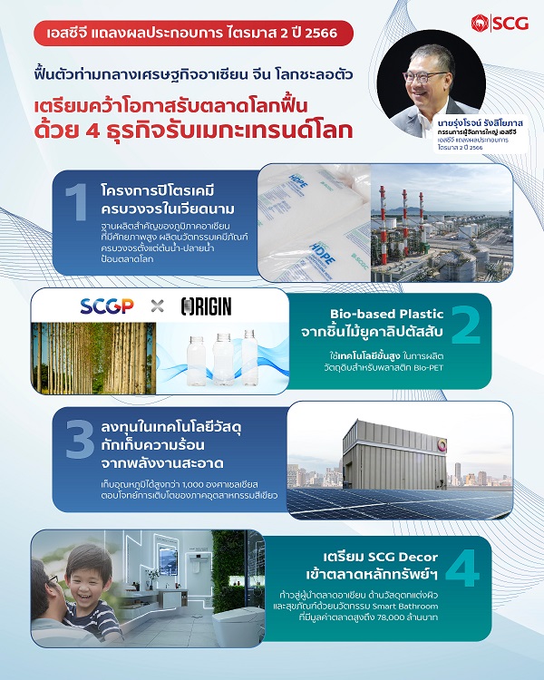 ผลประกอบการเอสซีจี ไตรมาส 2 ปี 2566 ฟื้นตัวจากการเร่งปรับตัวตามแผนงาน ท่ามกลางเศรษฐกิจอาเซียน จีน โลกชะลอตัว เตรียมคว้าโอกาสรับตลาดโลกฟื้นด้วย 4 ธุรกิจรับเมกะเทรนด์โลก โครงการปิโตรเคมีครบวงจรใหญ่สุดในเวียดนามผลิตเม็ดพลาสติกคุณภาพสูงป้อนตลาดในภูมิภาค - Bio-based Plastic จากชิ้นไม้ยูคาลิปตัสสับ ย่อยสลายได้ - วัสดุกักเก็บความร้อนจากพลังงานสะอาดสำหรับอุตสาหกรรมลดคาร์บอน - SCG Decor ปักธงเบอร์ 1 ในอาเซียน