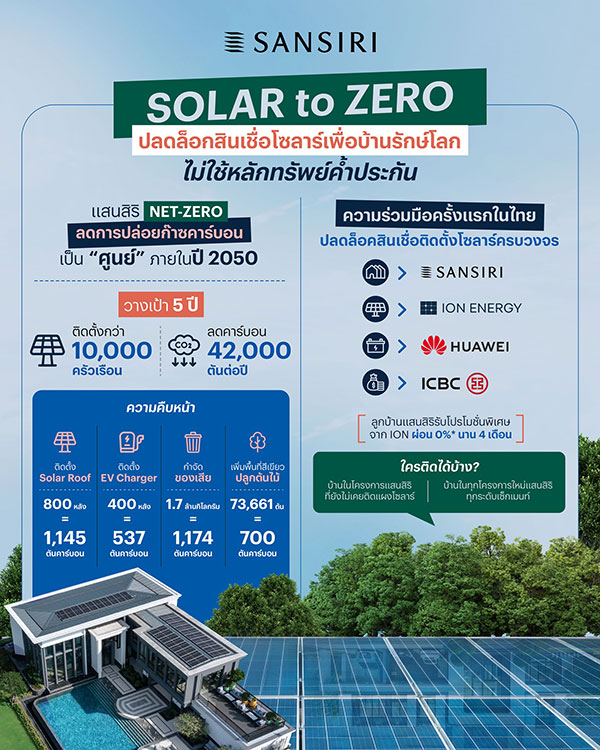 อุทัย อุทัยแสงสุข ประธานผู้บริหารสายงานปฏิบัติการ บริษัท แสนสิริ จำกัด (มหาชน) เผยว่า “การปฎิวัติการเข้าถึงพลังงานสะอาดของภาคอสังหาริมทรัพย์โดยเฉพาะระดับครัวเรือน ถือเป็นเป้าหมายสำคัญที่แสนสิริต้องการผลักดันให้เกิดขึ้นจริงและยั่งยืน เนื่องจากการเปลี่ยนพฤติกรรมการใช้พลังงานในที่อยู่อาศัย คือ แรงขับเคลื่อนสำคัญที่จะทำให้บรรลุเป้าหมายในการก้าวไปสู่ Net Zero ในระดับประเทศและระดับโลกต่อไปได้ อย่างไรก็ตาม ปัจจุบันการเข้าถึงพลังงานสะอาดในที่อยู่อาศัย ยังคงมีข้อจำกัดในการเข้าถึง ทั้งอุปกรณ์และการติดตั้งยังมีต้นทุนที่ราคาสูงถึงแม้ว่าต้นทุนเหล่านี้จะเริ่มมีการปรับราคาลดลงแต่ก็ยังเป็นอุปสรรคในการเข้าถึงด้านแหล่งเงินทุน เพื่อเป็นการปลดล็อกการเข้าถึงพลังงานสะอาดของครัวเรือน ล่าสุด แสนสิริ ได้ร่วมมือกับบริษัท หัวเว่ย เทคโนโลยี่ (ประเทศไทย) จํากัด, บริษัท ลีสซิ่งไอซีบีซี (ไทย) จำกัด และ บริษัท ไอออน เอนเนอร์ยี จำกัด ผนึกกำลังในการมอบบริการสินเชื่อเพื่อบ้านรักษ์โลก เพื่อให้ลูกบ้านได้ติดตั้งโซลาร์ด้วยสินเชื่อเงินกู้ดอกเบี้ยต่ำ 0%* ที่ไม่ต้องใช้หลักทรัพย์ค้ำประกันครั้งแรกในประเทศไทย ผ่านแคมเปญ “SOLAR to ZERO” ปลดล็อกการเข้าถึงพลังงานสะอาดได้มากขึ้นและง่ายขึ้น โดยมีกลุ่มเป้าหมายเป็นบ้านในโครงการของแสนสิริทั้งหมด โดยเฉพาะบ้านในโครงการแสนสิริ ที่ยังไม่เคยติดแผงโซลาร์ และมีนิติดูแล โดย พลัส พร็อพเพอร์ตี้ กว่า 300 โครงการ และนอกจากนี้บ้านในทุกโครงการใหม่แสนสิริ ทุกระดับเซ็กเมนท์ ที่ต้องการติดตั้งแผงโซลาร์เพิ่มจากเดิมที่แสนสิริติดตั้งให้ เพื่อรองรับการใช้งานและช่วยประหยัดค่าไฟฟ้ามากขึ้น โดยความร่วมมือครั้งนี้ ตั้งเป้าติดตั้งแผงโซลาร์ 100% จำนวน 10,000 ครัวเรือน ภายใน 5 ปี คาดว่าจะช่วยลดคาร์บอนได้ 42,000 ตันคาร์บอนต่อปี”