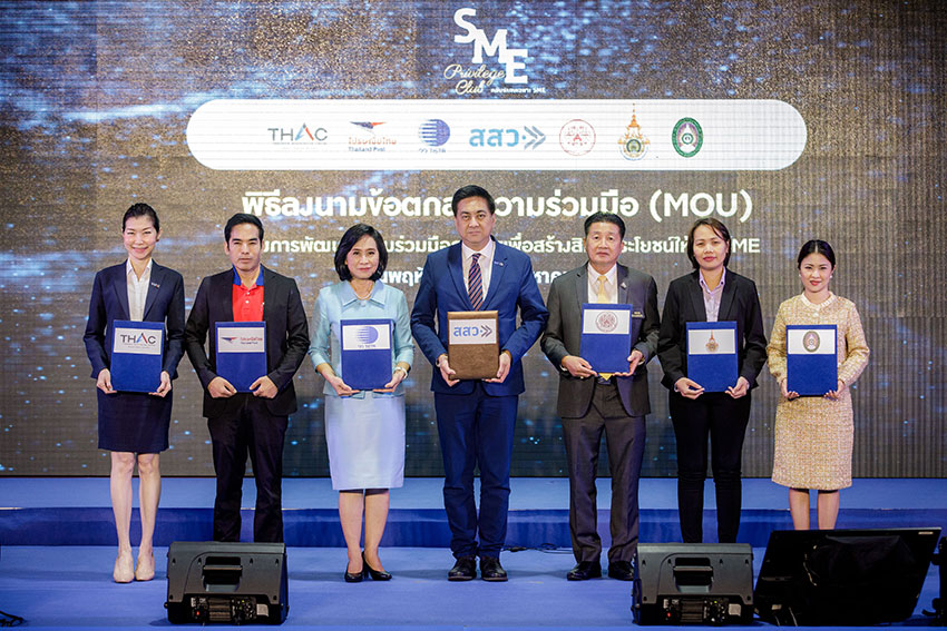 ภายใต้ “โครงการพัฒนาความร่วมมือภาครัฐเพื่อสร้างสิทธิประโยชน์ให้แก่ SME ปีงบประมาณ 2566” ให้ได้รับการส่งเสริมและสนับสนุนเบื้องต้นที่เหมาะสมกับธุรกิจ หวังสร้างแต้มต่อทางธุรกิจให้ผู้ประกอบการไทย จึงได้ร่วมกับ 6 หน่วยงานภาครัฐ ได้แก่ บริษัท ไปรษณีย์ไทย จำกัด สถาบันวิจัยวิทยาศาสตร์ และเทคโนโลยีแห่งประเทศไทย (วว.) สถาบันอนุญาโตตุลาการ (THAC) มหาวิทยาลัยเทคโนโลยีพระจอมเกล้าพระนครเหนือ (มจพ.) มหาวิทยาลัยเทคโนโลยีราชมงคลพระนคร (มทร.พระนคร) และมหาวิทยาลัยราชภัฏสวนสุนันทา (มร.สส.) ลงนามบันทึกความร่วมมือ (MOU) โดยมีเป้าหมายร่วมกันในการสร้างสภาพแวดล้อมเชิงบวกทางเศรษฐกิจ โอกาสทางธุรกิจแก่วิสาหกิจขนาดกลางและขนาดย่อมของไทย ในรูปแบบที่หลากหลายทั้ง การมอบส่วนลด การอบรมและพัฒนา การวิเคราะห์ประเมินในห้องวิจัย (lab) บริการด้านต่างๆ ของหน่วยงานเพิ่มเติม เป็นต้น