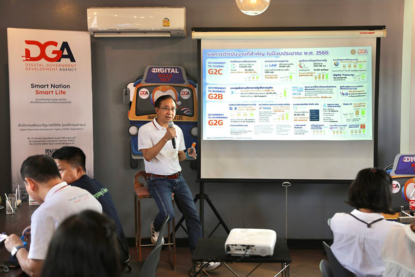 สำหรับในส่วนของ Government to Government (G2G) หรือ ระหว่างรัฐกับรัฐ DGA มุ่งเน้นการสนับสนุนการเชื่อมโยงข้อมูลของหน่วยงานภาครัฐกับรัฐ เช่น ศูนย์แลกเปลี่ยนข้อมูลกลางภาครัฐ (Government Data Exchange: GDX) เพื่อเชื่อมต่อระหว่างหน่วยงานรัฐ บนช่องทางการสื่อสารที่มีความปลอดภัย ปัจจุบันมีการเชื่อมโยงแล้ว 13 หน่วยงาน 74 API ข้อมูลบริการ และมีการเชื่อมโยงข้อมูลไปแล้ว 133.44 ล้านครั้ง นอกจากนี้ยังให้ความสำคัญกับการให้ความรู้กับบุคลากรภาครัฐ โดยการจัดตั้ง TDGA (สถาบันพัฒนาบุคลากรภาครัฐด้านดิจิทัล) เพื่อพัฒนาศักยภาพให้กับข้าราชการและบุคลากรภาครัฐให้มีความพร้อมในทักษะทางด้านดิจิทัลในการขับเคลื่อนหน่วยงานภาครัฐสู่การเป็นรัฐบาลดิจิทัล ได้ให้การอบรมบุคลากรภาครัฐไปแล้วกว่า 1,942,443 คน โดยในปี 67 จะขยายผลไปถึงบุคลากรระดับท้องถิ่น โดยจะมีการออกแบบหลักสูตรดิจิทัลสำหรับท้องถิ่นโดยเฉพาะ และจะพัฒนาทักษะดิจิทัล onsite โดย TDGA และเครือข่าย มากกว่า 2,000 ราย ผ่านช่องทาง Online ด้วยระบบ DGLP ที่รองรับผู้เรียน มากกว่า 300,000 ราย