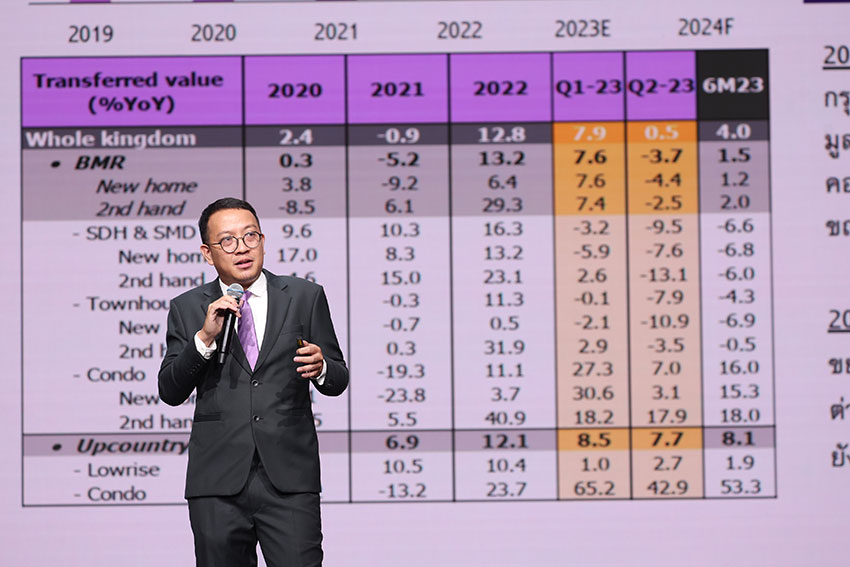 โดยความต้องการที่อยู่อาศัยในปีนี้ยังไม่ฟื้นตัวชัดเจน ภาพรวมทำให้เติบโตประมาณ 3% คาดว่าโครงการใหม่ที่เปิดตัวในปีนี้จะชะลอตัวเมื่อเทียบกับปี 2565 ที่ผ่านมา โดยอัตราการขายคอนโดฯเติบโตได้ดีกว่า แนวราบ เฉลี่ยในช่วง 7-8 เดือน ที่ผ่านมาขายได้ 30% หรือ สัดส่วน 1 ใน 3 ของโครงการ คาดว่าภาพรวมจะทยอยกลับมาฟื้นตัวในปี 2567 ส่วนแนวราบ ทาวน์เฮาส์ คาดว่าจะมีการจำหน่ายไม่มากนัก แต่ที่ขายดีคือ กลุ่มทาวน์เฮาส์มือ 2 เพราะราคาจับต้องได้