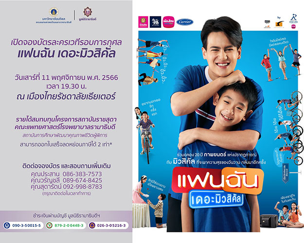 มูลนิธิรามาธิบดี ในพระราชูปถัมภ์ สมเด็จพระเทพรัตนราชสุดาฯ สยามบรมราชกุมารี เปิดตัวโครงการทุนสถาบันราชสุดา คณะแพทยศาสตร์โรงพยาบาลรามาธิบดี มุ่งมั่นสนับสนุนการศึกษาแก่คนพิการเพื่อผลิตบัณฑิตกลุ่มวิชาชีพครู หวังยกระดับคุณภาพชีวิตคนพิการในสังคมไทยให้มีความเป็นอยู่ที่ดี สร้างอาชีพ และพึ่งพาตนเองได้อย่างยั่งยืน พร้อมร่วมกับ บริษัท ซีเนริโอ จำกัด ชวนผู้ใจบุญ ชมละครเวทีรอบการกุศล “แฟนฉัน เดอะมิวสิคัล” ในวันเสาร์ที่ 11 พฤศจิกายน พ.ศ. 2566 จัดแสดง ณ เมืองไทยรัชดาลัย เธียเตอร์ รายได้ร่วมสมทบทุนเข้าโครงการทุนสถาบันราชสุดา