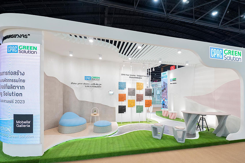 ซีแพคกรีนโซลูชัน (CPAC Green Solution) ชวนสัมผัสนวัตกรรมก่อสร้างผสานงานหัตถกรรมไทยเป็นเฟอร์นิเจอร์ SAAN Collection ผลงานการออกแบบและพัฒนาสินค้าร่วมกับ Mobella โดยนำนวัตกรรมการพิมพ์คอนกรีต 3 มิติ ประยุกต์เข้ากับการสาน เกิดเป็นเฟอร์นิเจอร์ที่มีเอกลักษณ์เฉพาะตัว นอกจากนี้ยังพบกับการตกแต่งพื้นและผนังจาก CPAC Marble Render งานฉาบผิวหน้าคอนกรีตด้วยมาร์เบิ้ลเรนเดอร์ ที่ผสมหินอ่อนและมิลเลอร์สโตน หินกระจกคัดพิเศษ ทำให้ผิวหน้ามีความวิบวับ สวยงามอย่างแตกต่าง ปูตัดกับพื้นคอนกรีตพิมพ์ลาย CPAC Stamped Concrete เท่สไตล์ลอฟต์
