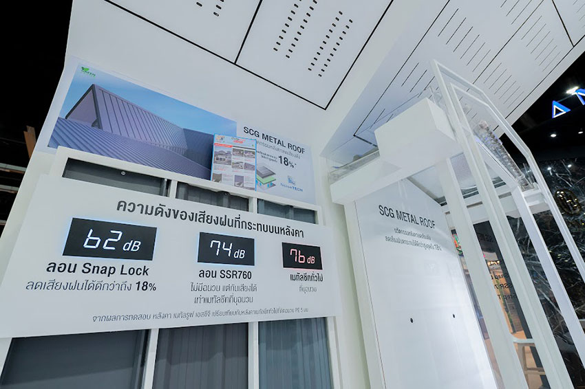 เอสซีจีนำเสนอนวัตกรรมตอบโจทย์การอยู่อาศัยแบบสมาร์ท ภายใต้คอนเซปต์ “บ้านที่ช่วยดูแลคุณ” ในโซน SCG Smart Home Living Zone ดูแลทั้งเรื่องการจัดการพลังงาน Smart Energy กับโซลูชันประหยัดไฟและใช้พลังงานอย่างคุ้มค่าจาก SCG Solar Roof Solutions ดูแลคุณภาพอากาศ Smart Air Quality จาก SCG Active Air Quality โซลูชันปกป้องอากาศในบ้านให้ปลอดภัยจากเชื้อโรคต่าง ๆ และฝุ่น เปิดตัวเครื่องรุ่นใหม่ Cool X i2 ที่มีเทคโนโลยีแลกเปลี่ยนพลังงานและอุณหภูมิ ทำให้อุณหภูมิเย็นลงก่อนเข้าสู่ตัวบ้าน พร้อมเพิ่มประสิทธิภาพการกรองอากาศด้วยฟิลเตอร์ถึง 6 ชั้น รวมทั้งระบบปรับการกรองฝุ่นตามค่าฝุ่นแบบอัตโนมัติ เพื่อให้กรองได้รวดเร็วและมีประสิทธิภาพยิ่งขึ้น นอกจากนี้ เอสซีจียังยกขบวนนวัตกรรมวัสดุก่อสร้างเติมเต็มทุกความต้องการเรื่องบ้าน ในโซน SCG Smart Materials Zone ไม่ว่าจะเป็น Smart Design กับงานศิลปะบนผืนหลังคาจากหลังคาเซรามิก เอสซีจี รุ่น EXCELLA CRESTA งานปรับปรุงอาคารให้สวยงามเป็นเอกลักษณ์ ด้วยเดการ์บายเอสซีจี (DECAAR by SCG) ผู้ให้บริการงานโซลูชันฟาซาด (Façade - เปลือกอาคาร) และงานโซลูชันตกแต่งภูมิทัศน์ภายนอก Smart Life เพิ่มความน่าอยู่ให้บ้านเย็นสบาย และใช้ชีวิตได้อย่างลงตัว ด้วยอะคูสติกโซลูชัน ฝ้าสมาร์ทบอร์ดรุ่นระบายอากาศ-โพรเทคชั่น ฉนวนกันความร้อน STAYCOOL Smart Experience สร้างประสบการณ์ด้วยผนังตกแต่งหลากสไตล์ จากผนังตกแต่งเอสซีจี รุ่นโมดิน่า ไม้ฝาเอสซีจี สีมินิมอลบีช และเอาใจคนรักต้นไม้ด้วย Green House Corner รวมถึงการทดสอบคุณสมบัติคุณภาพสินค้า อาทิ ทดสอบการกันเสียงจากนวัตกรรม NoiseTECH ของหลังคาเมทัลชีท เอสซีจี ทดสอบการกันเสียงจากเทปกันเสียง NoiseZeal ทดสอบการกันความร้อนของแผ่นสะท้อนความร้อน อัลตร้าคูล และทดสอบประสิทธิภาพของอินโนกรีน บล็อกปูพื้นที่ลดปัญหาการเกิดน้ำท่วมขัง