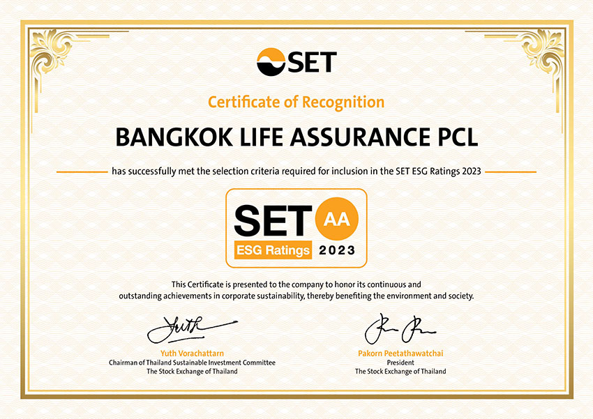 บริษัท กรุงเทพประกันชีวิต จำกัด (มหาชน) ได้รับการคัดเลือกให้อยู่ในรายชื่อหุ้นยั่งยืน “SET ESG Ratings” ต่อเนื่องเป็นปีที่ 3 โดยในปีนี้ได้รับผลการประเมินในระดับ AA ประจำปี 2566 จากตลาดหลักทรัพย์แห่งประเทศไทย โดยเป็น 1 ใน 193 บริษัทจดทะเบียนที่ได้รับการประกาศผลประเมินหุ้นยั่งยืน SET ESG Ratings สะท้อนถึงความมั่นคงในการดำเนินธุรกิจอย่างยั่งยืนของกรุงเทพประกันชีวิต ภายใต้วิสัยทัศน์และพันธกิจในการสร้างความมั่นคงทางการเงินให้กับประชาชนทุกกลุ่ม ด้วยการปกป้องคุณค่าชีวิต การให้คำแนะนำด้านการวางแผนการเงิน และบริการที่ประทับใจผ่านตัวแทน คู่ค้า และพนักงาน ที่มีความจริงใจและมีความรู้ระดับแนวหน้าของประเทศ ควบคู่ไปกับการให้ความสำคัญกับการดูแลผู้มีส่วนได้เสีย มีความรับผิดชอบต่อสังคม ชุมชน และสิ่งแวดล้อม รวมถึง การบริหารงานตามหลักบรรษัทภิบาลที่ดี (Environmental, Social and Governance: ESG) พร้อมรับมือกับความเปลี่ยนแปลง และสร้างโอกาสในการแข่งขันผ่านนวัตกรรมทางธุรกิจ สู่การขับเคลื่อนองค์กรให้เติบโตอย่างยั่งยืน