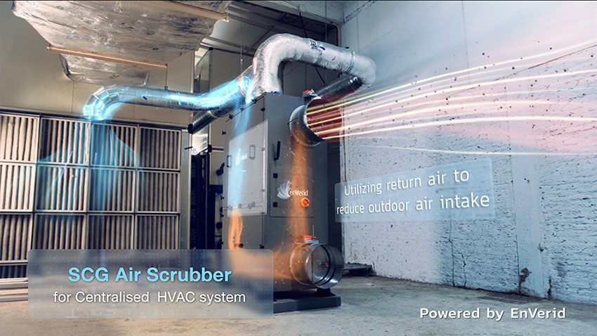 โดยระบบ SCG Air Scrubber คือเทคโนโลยีที่ช่วยเพิ่มประสิทธิภาพให้กับระบบปรับอากาศและระบายอากาศ (HVAC System) โดยการบำบัดมลพิษอากาศภายในอาคาร ช่วยป้องกันไม่ให้ระบบปรับอากาศและระบายอากาศ (HVAC System) ชำรุด เสียหาย และลดภาระการทำความเย็นที่ต้องดูดอากาศจากภายนอกเข้ามาเกินความจำเป็น ตลอดจนสามารถดูดซับก๊าซคาร์บอนไดออกไซด์ ในอาคารให้มีค่าไม่เกิน 750 ppm โดยอ้างอิงจากปริมาณที่อนุญาตตามมาตรฐานคุณภาพอากาศภายในอาคาร (IAQP ASHRAE Standard 62.1) ทั้งนี้ ระบบ SCG Air Scrubber ยังสามารถช่วยลดการปล่อยก๊าซเรือนกระจก ได้อย่างน้อย 8 Kg CO2/sq.m/year ซึ่งในปี 2020 ที่ผ่านมา SCG Air Scrubber ถูกรับเลือกให้เป็น 1 ใน 9 นวัตกรรมที่มีความโดดเด่นในสาขา Smart Heat & Air จาก The Clean Fight 2020 นิวยอร์ก ประเทศสหรัฐอเมริกา ซึ่งเป็นองค์กรที่รับการสนับสนุนจากหน่วยงานวิจัยและพัฒนา พลังงานแห่งรัฐนิวยอร์ก New York State Energy Research & Development (NYSERDA) มาแล้วอีกด้วย