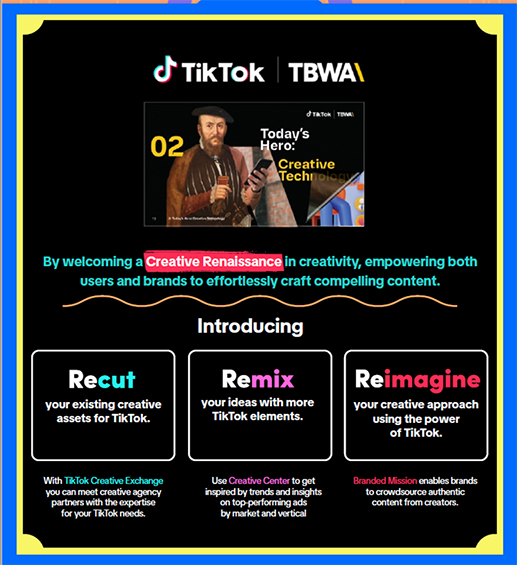 - The Next Creative Renaissance: TikTok ทราบดีว่าของความคิดสร้างสรรค์มีส่วนสำคัญถึง 50% ที่จะช่วยให้แคมเปญโฆษณาประสบความสำเร็จ TikTok จึงได้จัดทำรายงานที่ชื่อว่า 'Storytelling in the Next Creative Renaissance' ที่นำเสนอเทคนิค 3R ที่แบรนด์สามารถนำไปประยุกต์ใช้ได้ง่ายๆ ประกอบด้วย Recut, Remix และ Reimagine เพื่อเป็นโซลูชันให้แก่ธุรกิจในการต่อยอดความคิดสร้างสรรค์ของพวกเขาบน TikTok ซึ่งตัวอย่างความสำเร็จเห็นได้ชัดเจนจาก Netflix ประเทศไทยที่ปรับใช้เทคนิค 3R ของ TikTok ได้อย่างมีประสิทธิภาพสำหรับซีรี่ย์เรื่อง 'Delete' โดย Netflix เริ่มต้นด้วยการทำ 'Recut' เพื่อกระตุ้นความสนใจจากผู้ชม จากนั้น 'Remix' เนื้อหาให้เข้ากับสไตล์ของ TikTok และดึงดูดผู้ใช้ด้วยเกม 'Delete or Keep' ที่มีนักแสดงจาก ซีรีส์เป็นส่วนหนึ่ง และสุดท้าย 'Reimagine' แคมเปญด้วยเทคโนโลยีของ TikTok ที่พวกเขายังได้เปิดตัว Branded Effect ที่นำไปสู่วิดีโอที่สร้างโดยผู้ใช้มากกว่า 3,000 วิดีโอ ที่สะท้อนให้เห็นถึงพลังของแพลตฟอร์มในการเพิ่มพูนความคิดสร้างสรรค์ในการเล่าเรื่องได้เป็นอย่างดี