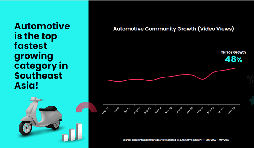 ในปี 2566 TikTok ไม่เพียงแต่ปฏิวัติวงการช้อปปิ้งและความบันเทิงเท่านั้น แต่ยังมีอิทธิพลอย่างมากต่ออุตสาหกรรมยานยนต์และการเงินอีกด้วย โดย 'Automotive Unboxed' แสดงให้เห็นถึงบทบาทของ TikTok ในการเปลี่ยนแปลงอุตสาหกรรมยานยนต์ ด้วยการเป็นแพลตฟอร์มที่ขับเคลื่อนการมีส่วนร่วมอย่างที่ไม่เคยเกิดขึ้นมาก่อน และมีอิทธิพลต่อการตัดสินใจของผู้บริโภคในการซื้อยานพาหนะ สะท้อนการเติบโตกว่า 48% ของยอดดูวิดีโอที่เกี่ยวข้องกับเนื้อหาเกี่ยวกับยานยนต์ในประเทศไทยเมื่อเทียบเป็นรายปีซึ่งตอกย้ำการขยายตัวอย่างรวดเร็วของหมวดหมู่นี้ ควบคู่ไปกับข้อมูลเชิงลึกที่ยังเผยให้เห็นว่าผู้ใช้ TikTok มากกว่า 40% ที่เป็นรวมไปถึงผู้ที่มีอายุมากกว่า 35 ปีมีส่วนร่วมอย่างแข็งขันกับเนื้อหาเกี่ยวกับยานยนต์ ซึ่งหลายคนอาจเป็นผู้ซื้อรถยนต์รายใหม่ที่ได้รับอิทธิพลจากเนื้อหาของ TikTok