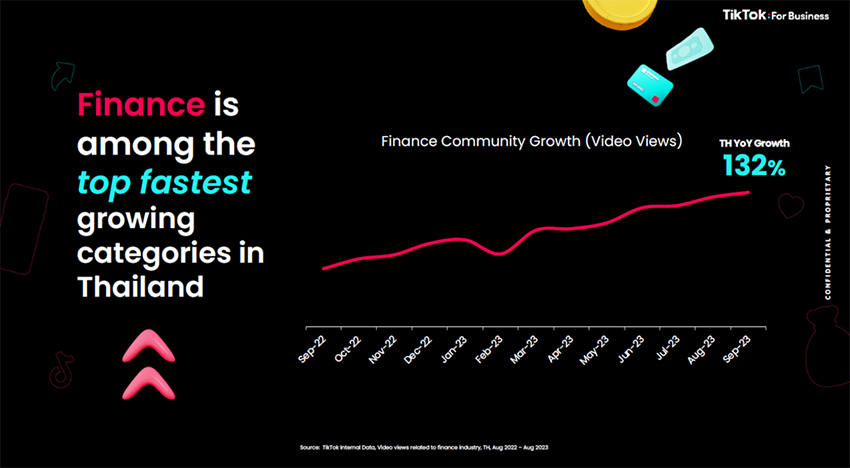 ในขณะเดียวกัน 'Finance Unboxed' ได้เผยให้เห็นถึงอิทธิพลที่เพิ่มขึ้นของ TikTok ในภาคการบริการทางการเงิน โดย TikTok ได้กลายเป็นแหล่งข้อมูลสำคัญสำหรับการให้คำแนะนำและคำปรึกษาข้อมูลทางการเงิน เห็นได้จากยอดการดูเนื้อหาในหมวดหมู่การเงินที่เพิ่มขึ้น 132% เมื่อเทียบเป็นรายปี ข้อมูลเชิงลึกยังแสดงให้เห็นอีกว่าผู้ใช้ TikTok 96% ดำเนินการบางอย่างหลังจากเห็นโฆษณาหรือเนื้อหาทางการเงิน ผู้ใช้ TikTok ยังมีการหาคำแนะนำด้านการเงินในเรื่องต่างๆ บนแพลตฟอร์มอย่างกระตือรือร้น ไม่ว่าจะเป็น คำแนะนำในการจัดการค่าใช้จ่าย การเพิ่มรายได้ การเปรียบเทียบผลิตภัณฑ์ทางการเงิน และการจัดการกับผลกระทบของอัตราเงินเฟ้อ อีกทั้ง พฤติกรรมของผู้ใช้ยังมีการเปลี่ยนแปลงอย่างมีนัยสำคัญ โดยปริมาณการค้นหาหัวข้อทางการเงินเพิ่มขึ้นกว่า 112% ตั้งแต่เดือนกันยายน 2022 ถึงกันยายน 2023 ซึ่งสะท้อนถึงความสนใจอย่างมากในการหาความรู้ด้านการเงินและการตัดสินใจ
